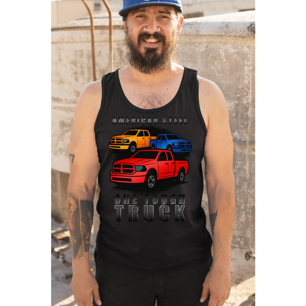 Bold truck design with red, yellow, and blue pickups. Built for fans of American steel, tough performance, and road warrior pride.