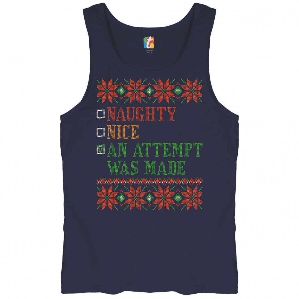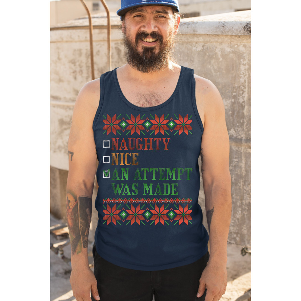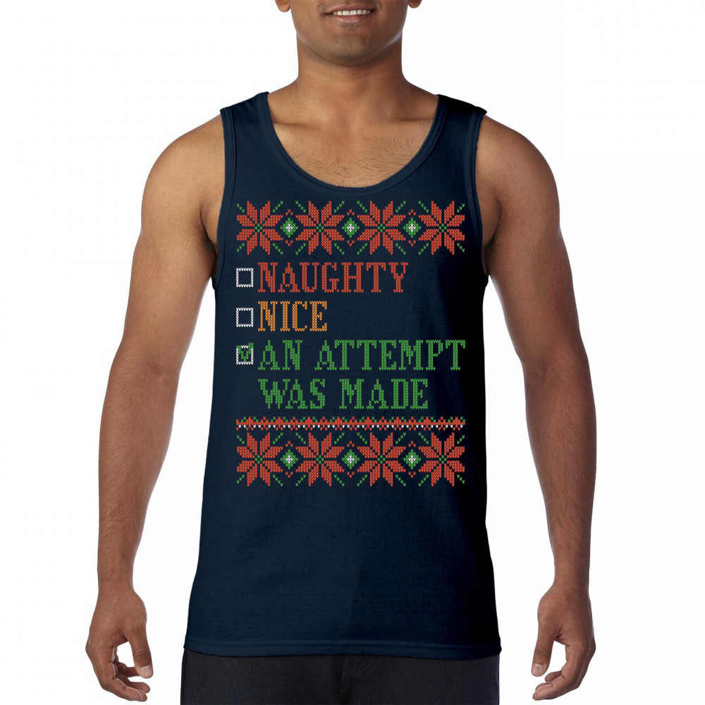 AN ATTEMPT WAS MADE tank top ugly sweater naughty or nice christmas men's top navy blue