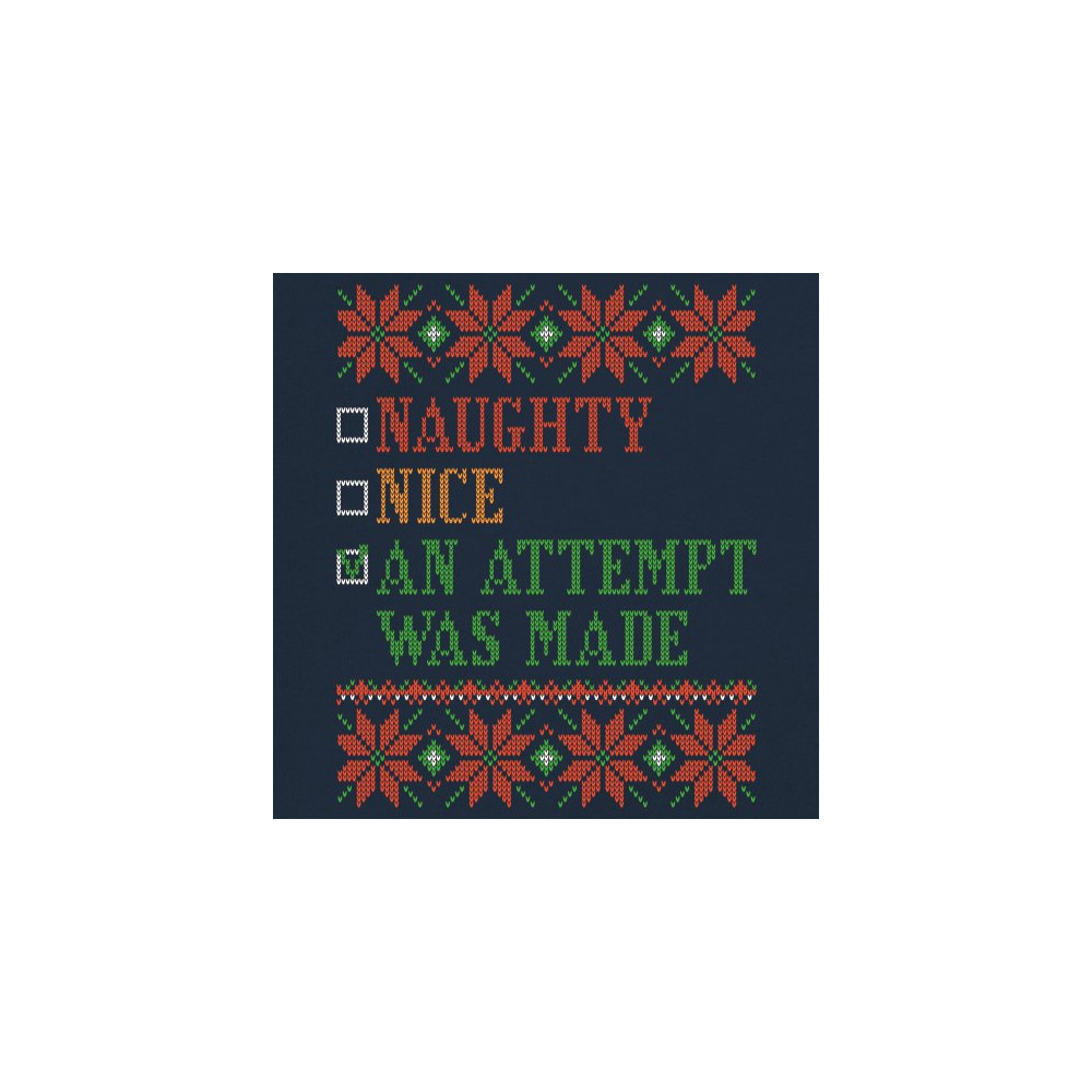 A funny print featuring a check list with options: "Naughty", "Nice" and a checked one "An Attempt Was Made". The print is decorated as an ugly sweater. Amazing choice to make people smile and spread positive vibes on Christmas Eve.
