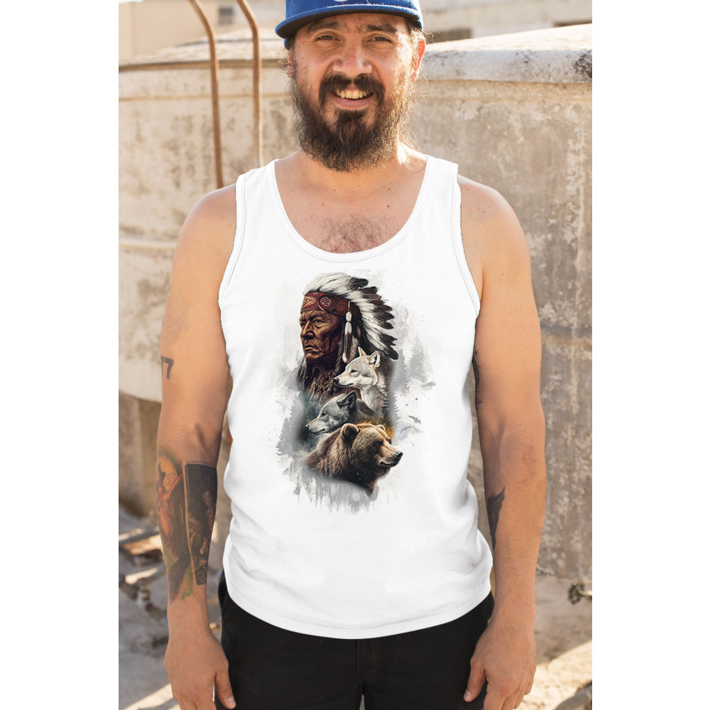 Tribal design with Native elder, wolves, and bear. A spiritual tribute to strength, wisdom, and guardianship in forest spirit symbolism.