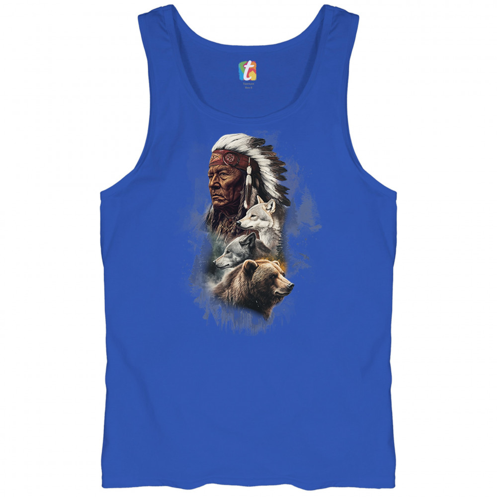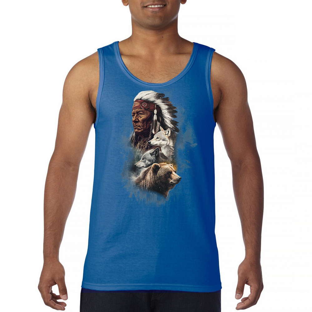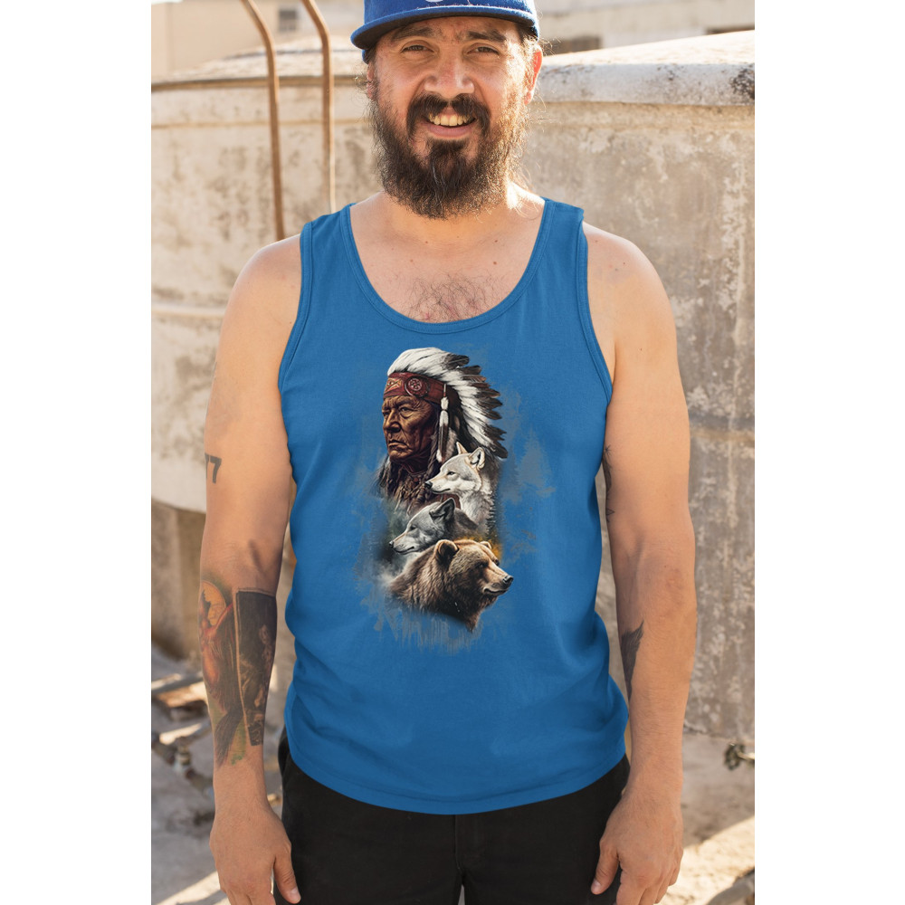 Celebrate spiritual strength and heritage with this design featuring a Native American elder alongside wolves and a bear. This tribal and totemic art reflects wisdom, guardianship, and deep forest spirit energy. Perfect for cultural pride, animal lovers, and those connected to spiritual symbolism in nature.