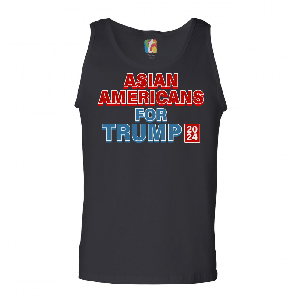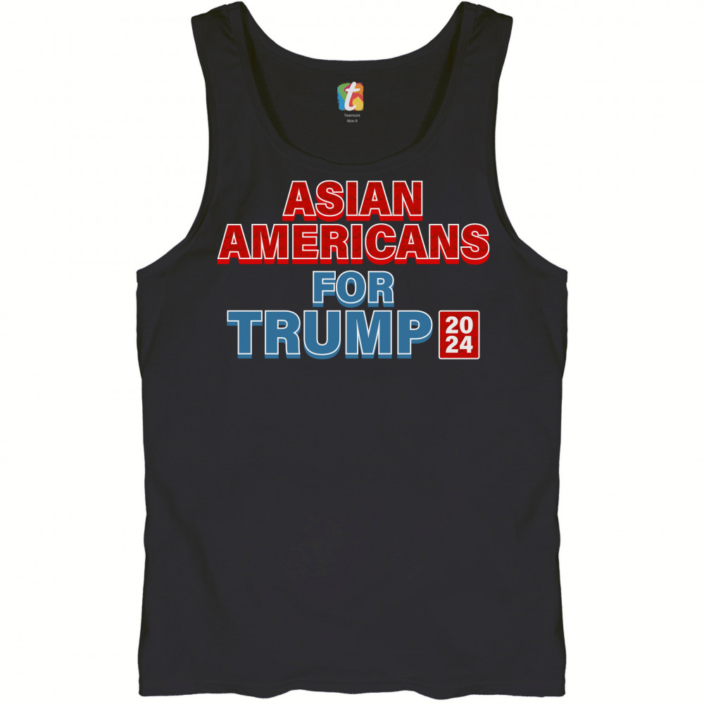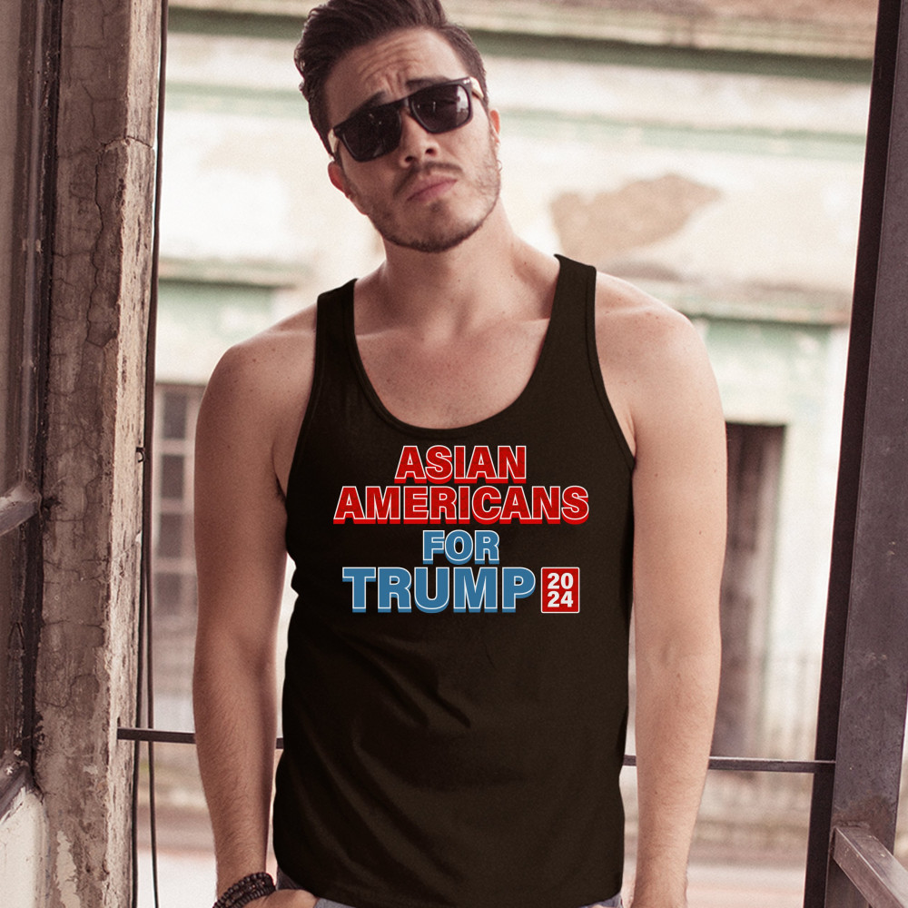 A political print saying "Asian Americans for Trump 2024". The words "Asian Americans" and the square with 2024 also have a pattern inside. A great choice to wear for a Trump rally or give as a gift to a Donald Trump supporter before 2024 presidential ele