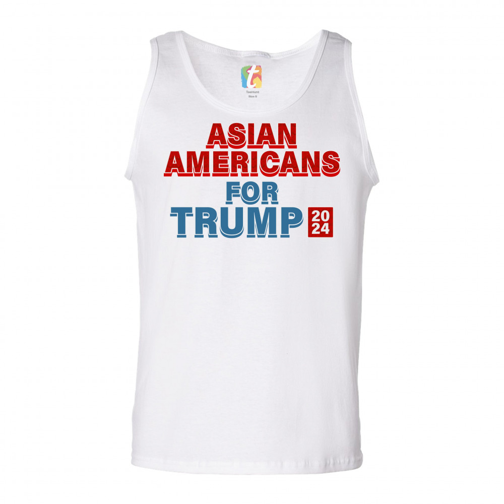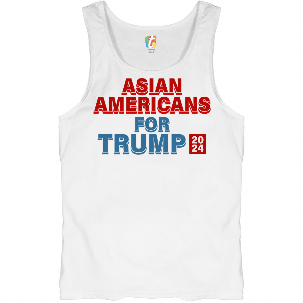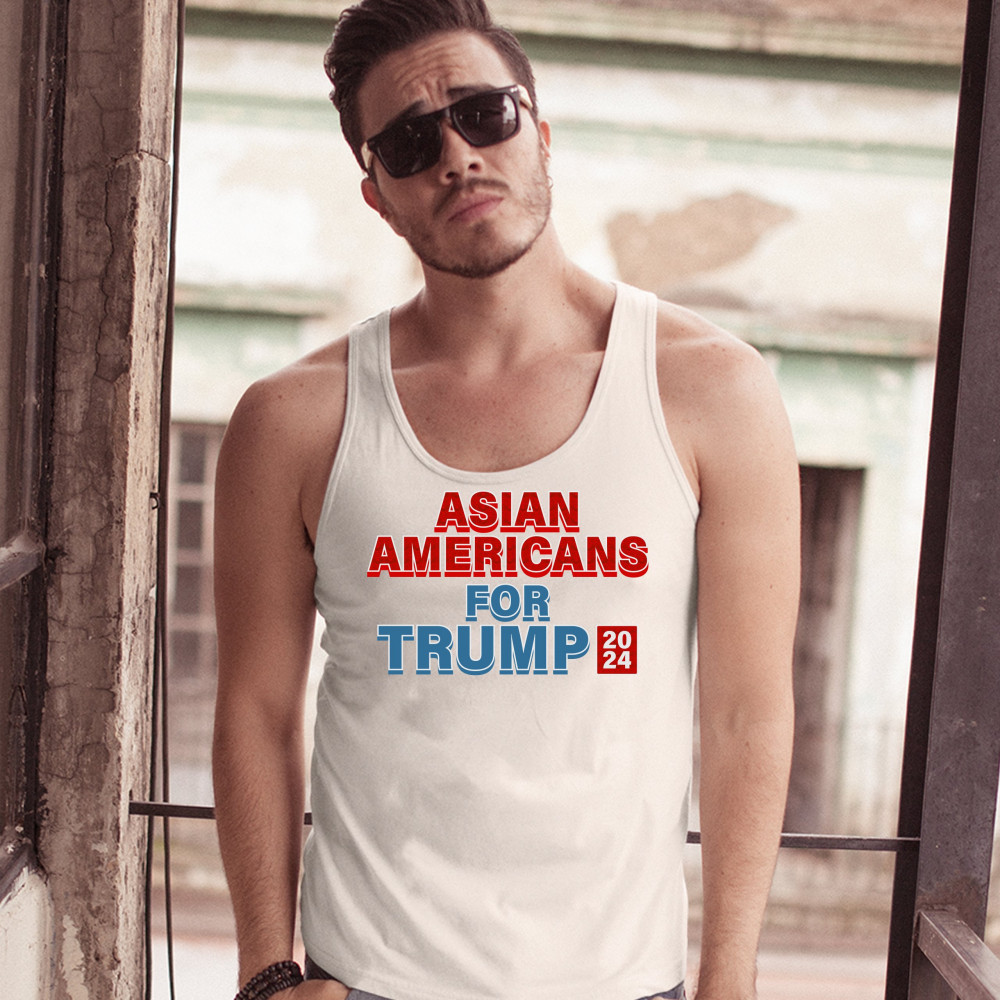 A political print saying "Asian Americans for Trump 2024". The words "Asian Americans" and the square with 2024 also have a pattern inside. A great choice to wear for a Trump rally or give as a gift to a Donald Trump supporter before 2024 presidential ele