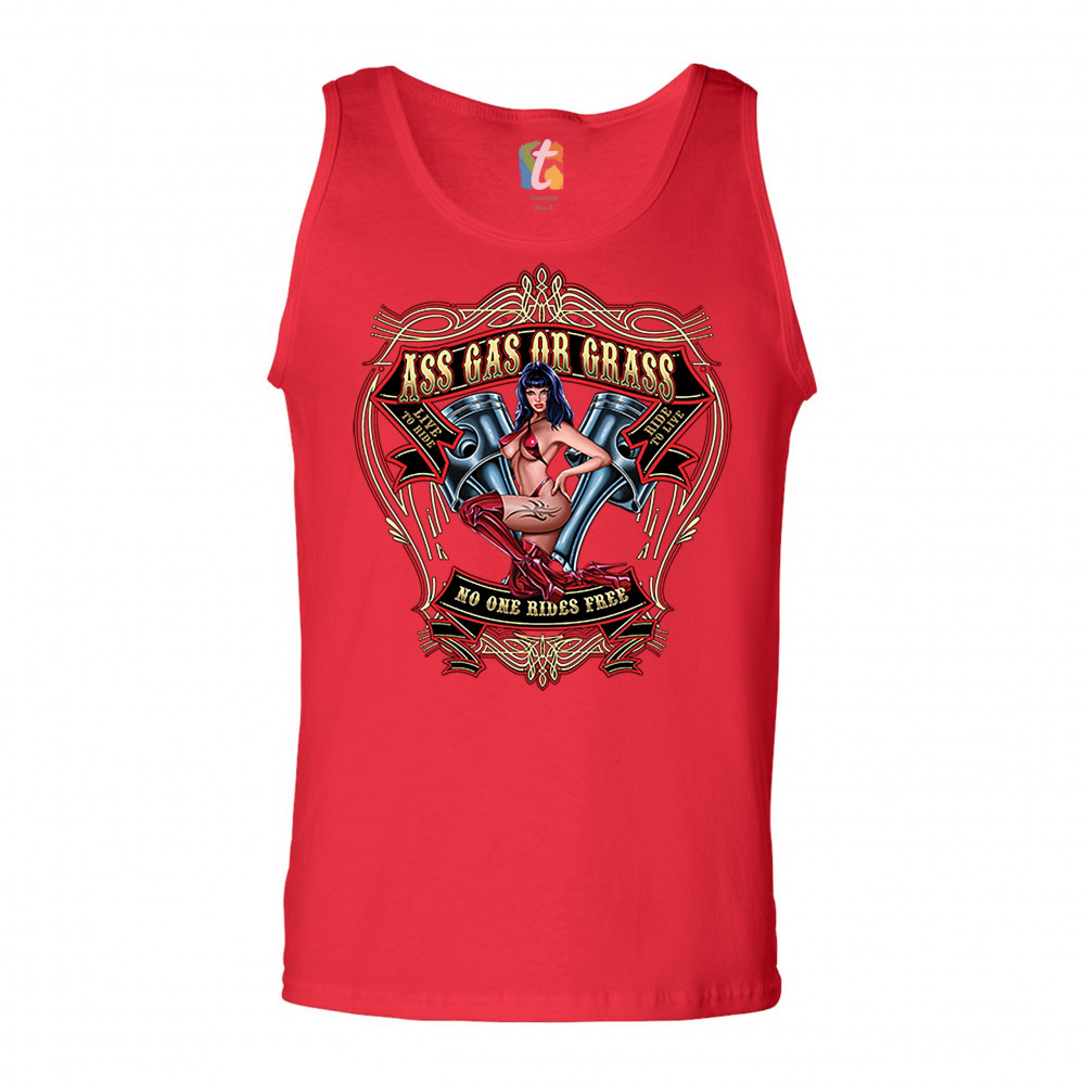 A print featuring a sexy girl in high heels. On multiple stripes or signs the print says: "Ass Gas or Grass, Live to Ride, Ride to Live, No One Rides Free". There are huge pistons in the background. A great choice for a motorcycle enthusiast.