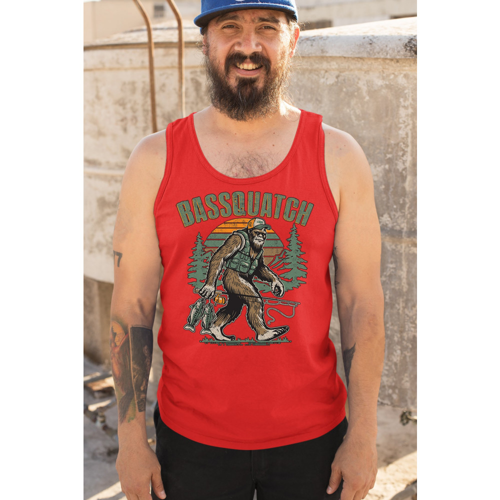 Funny Bassquatch design blends Bigfoot, fishing humor, and retro forest style. Great for anglers, cryptid lovers, and outdoorsy pun fans.
