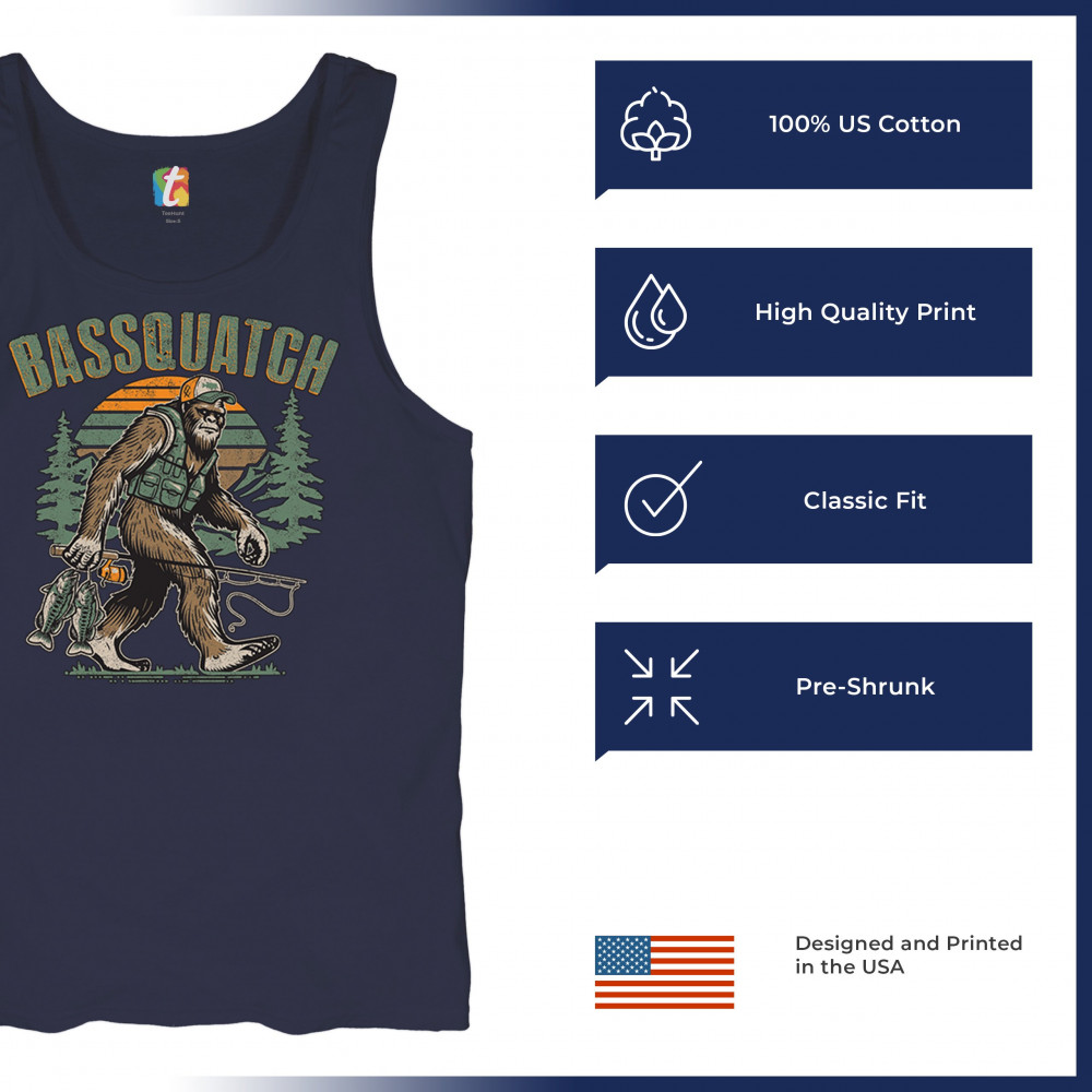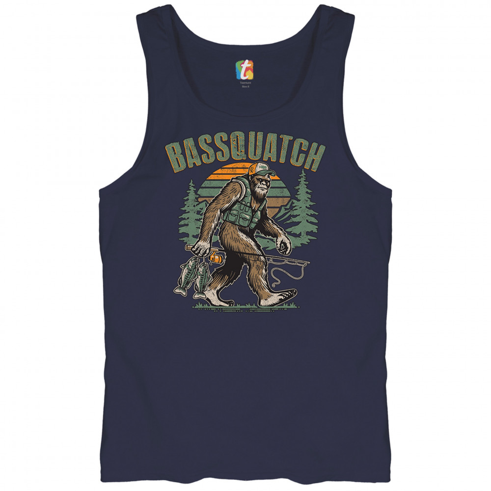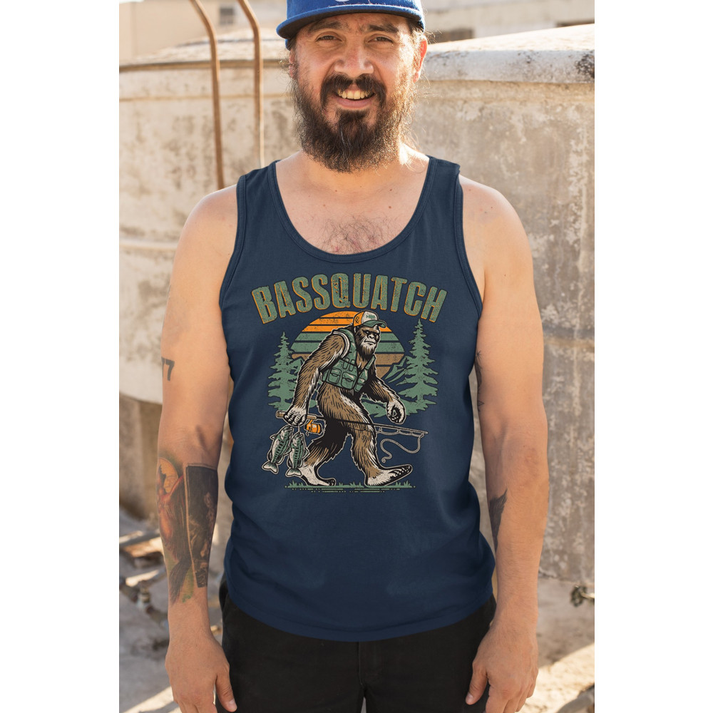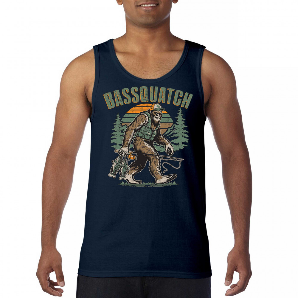 Funny Bassquatch design blends Bigfoot, fishing humor, and retro forest style. Great for anglers, cryptid lovers, and outdoorsy pun fans.