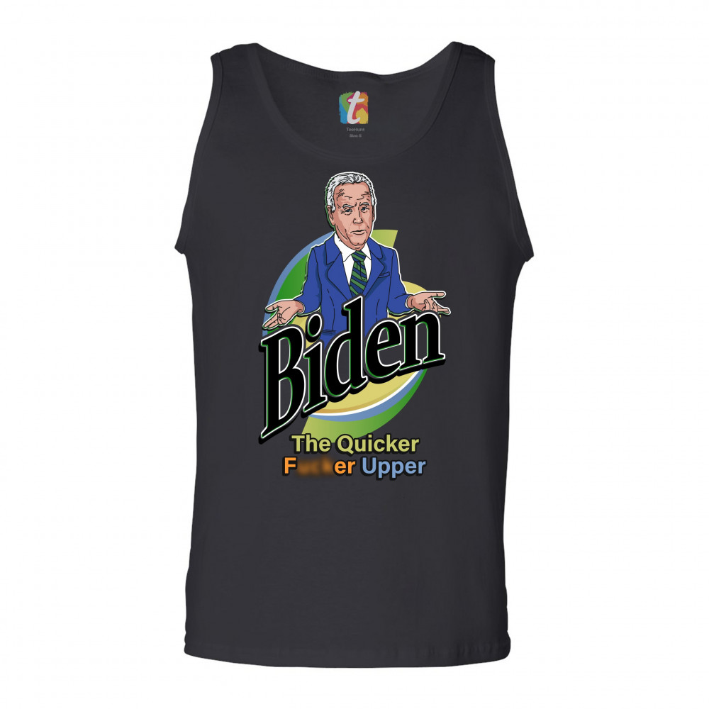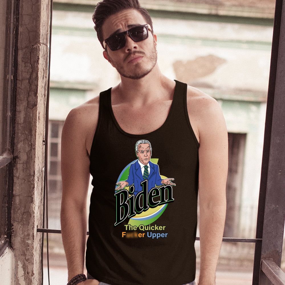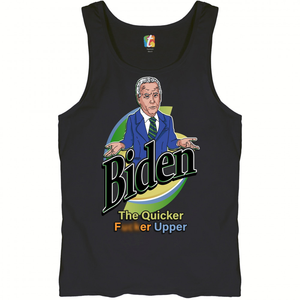 A funny political print featuring a confused Joe Biden shrugging his shoulders and spreading his arms. The print says "Biden the Quicker F*cker Upper". A great choice to wear for a Trump rally or give as a gift to a Donald Trump supporter before 2024 pres