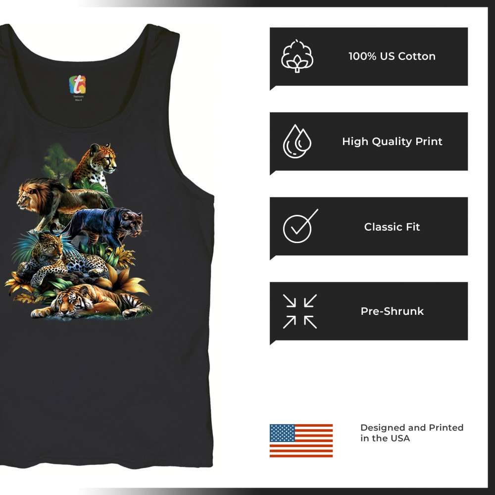 Celebrate raw power and untamed beauty with this stunning big cat design featuring lion, tiger, cheetah, black panther, jaguar, and leopard. Surrounded by vivid jungle foliage, each animal radiates strength, pride, and wild spirit. Perfect for fans of nature, safari vibes, wildlife preservation, and fierce animal energy.