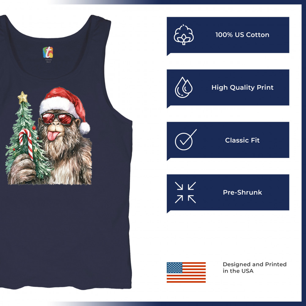Bigfoot Christmas Santa shirt – festive Sasquatch holiday humor tee with Santa hat design, Xmas tree, candy cane, and funny Christmas style.