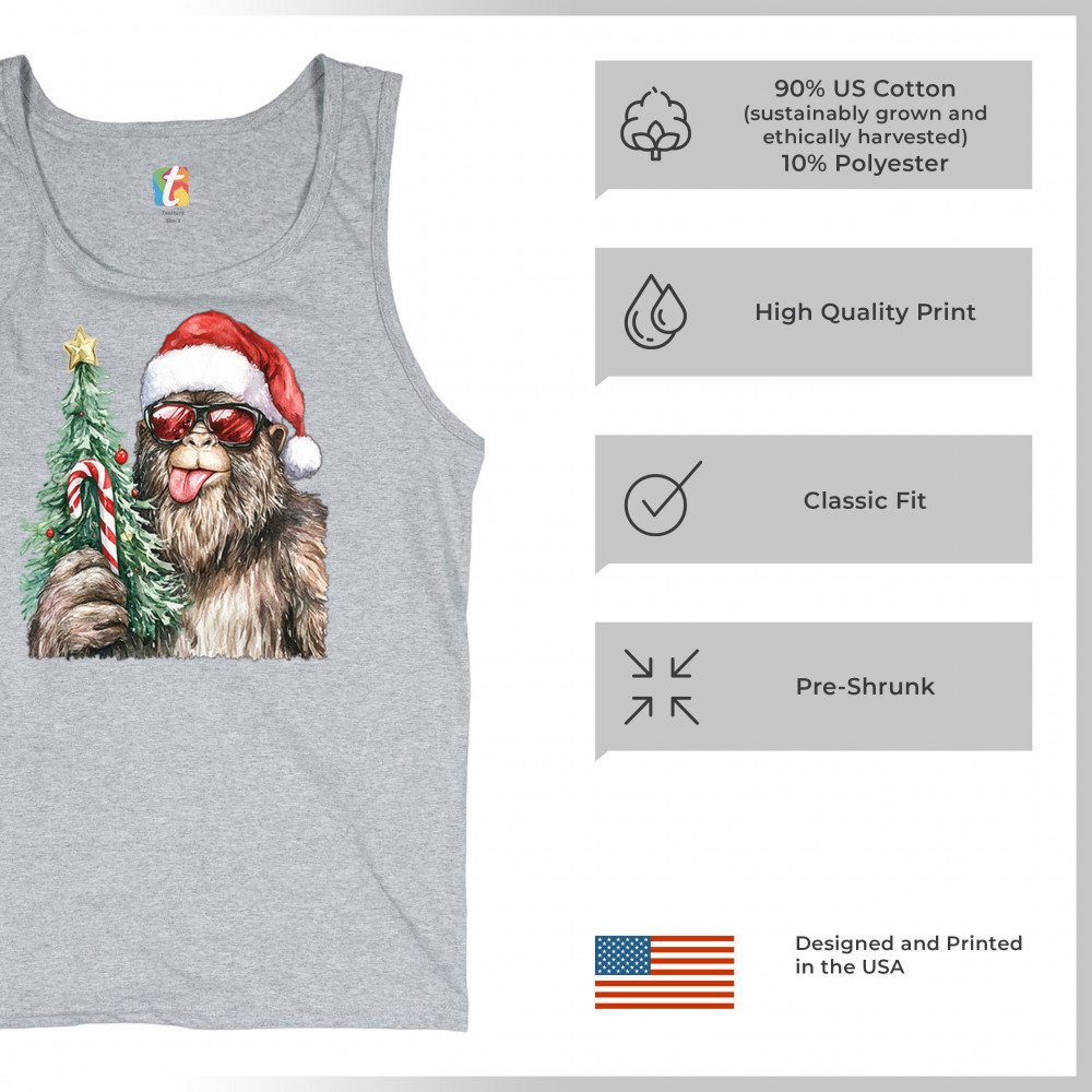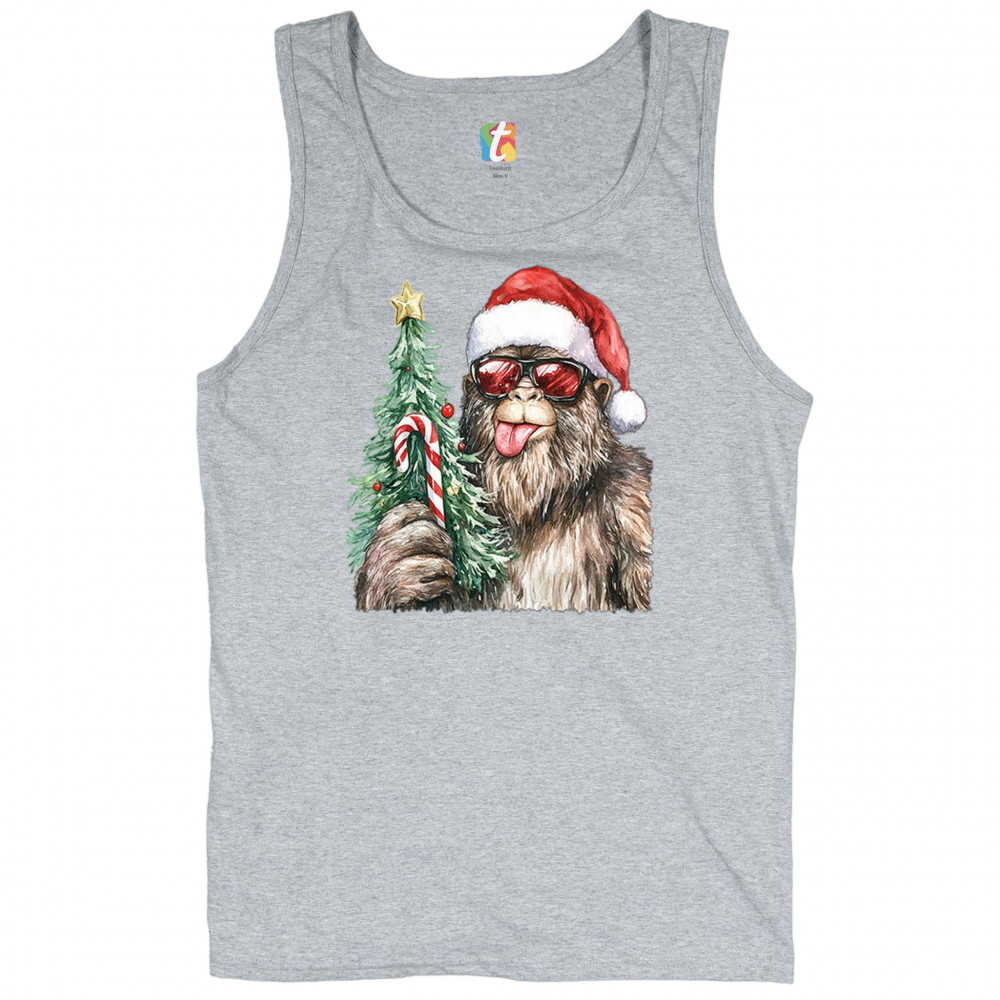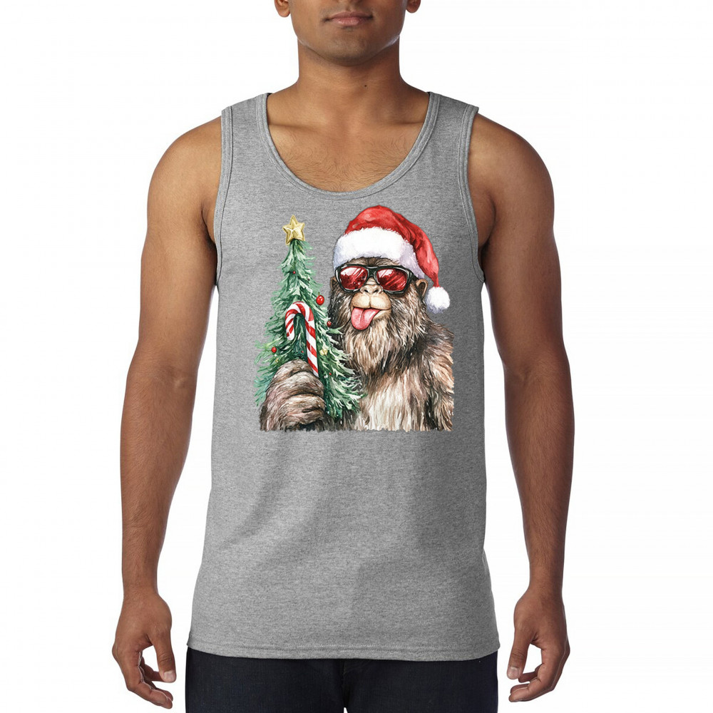 Bigfoot Christmas Santa shirt – festive Sasquatch holiday humor tee with Santa hat design, Xmas tree, candy cane, and funny Christmas style.