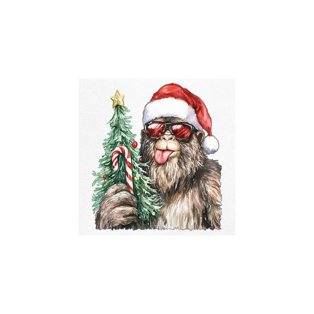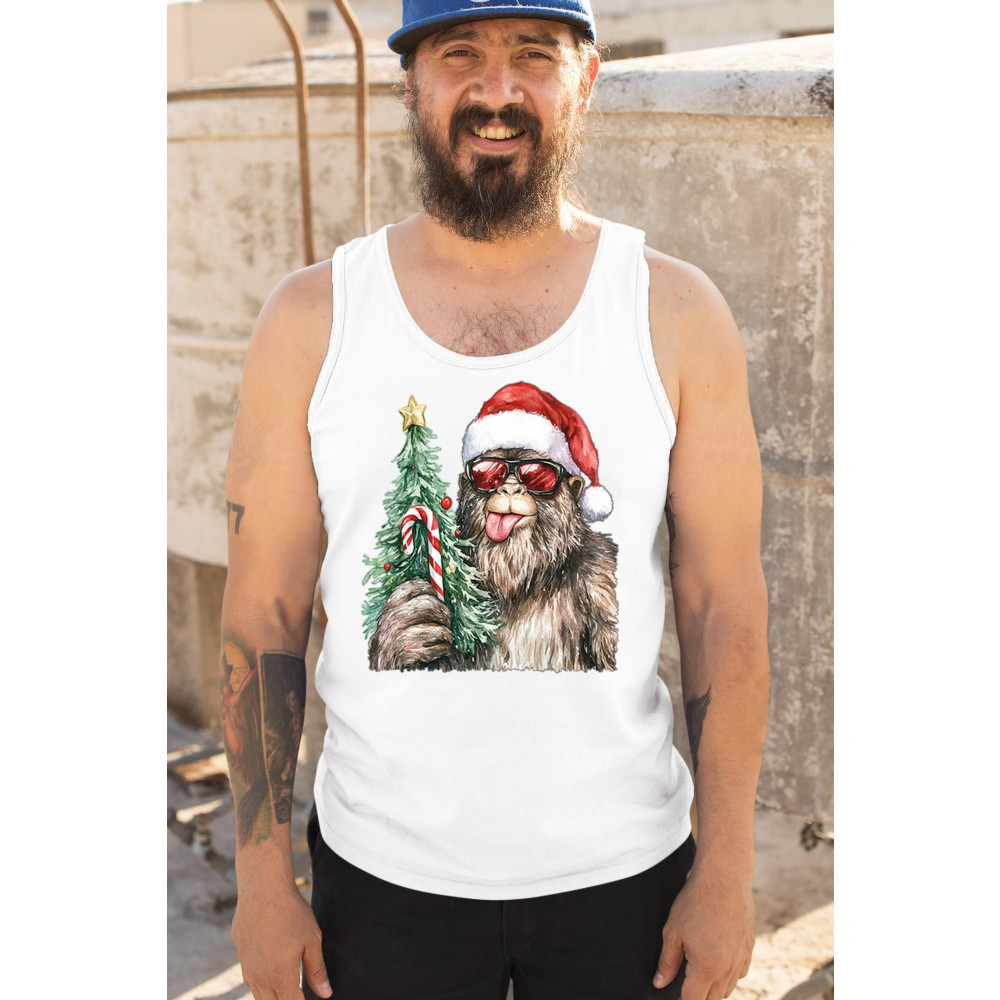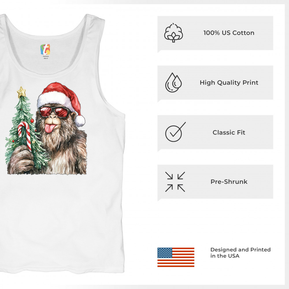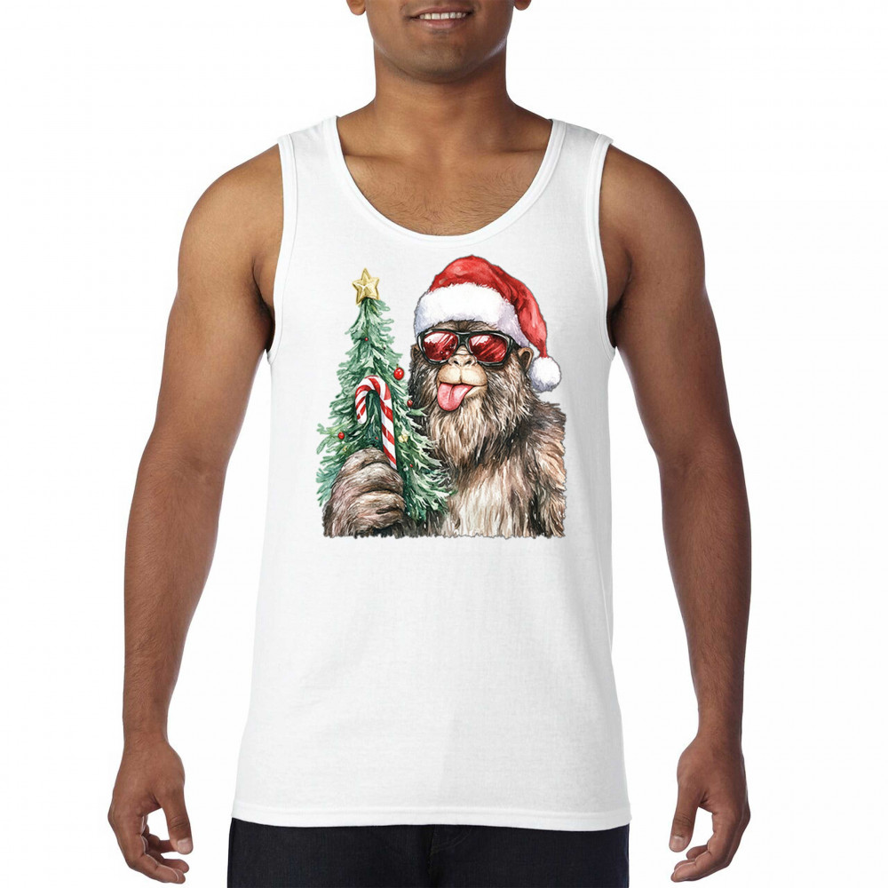 Bigfoot Christmas Santa shirt – festive Sasquatch holiday humor tee with Santa hat design, Xmas tree, candy cane, and funny Christmas style.