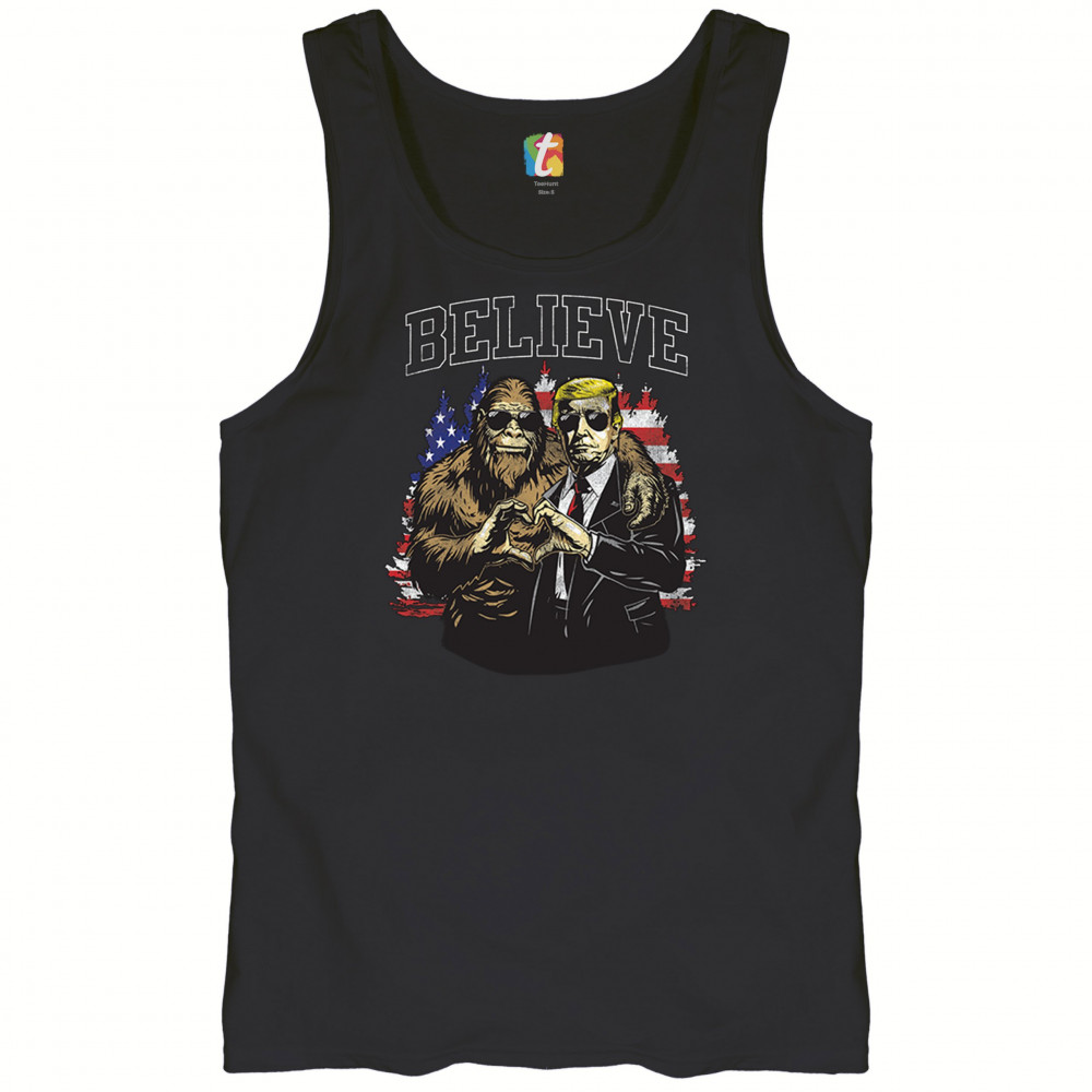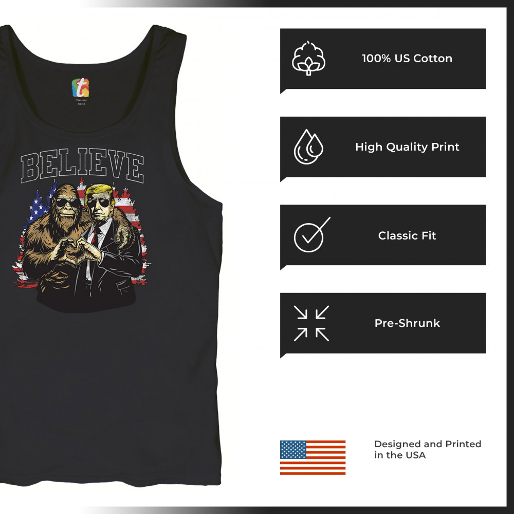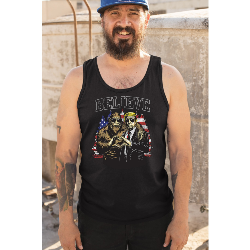 The "Believe" design combines patriotic pride and conservative values with a touch of fun. Featuring Donald J. Trump and a loyal Bigfoot against the American flag, this graphic is perfect for Trump supporters, Republicans, and believers in America First. Celebrate the Red Wave, the 47th President, and the unstoppable fight for victory. Ideal for anyone with unwavering belief in the people's mandate.