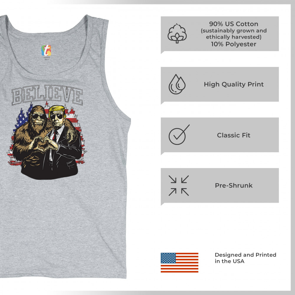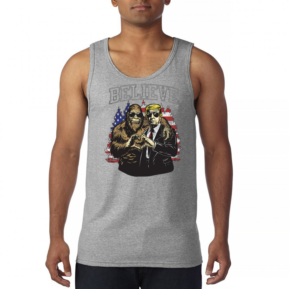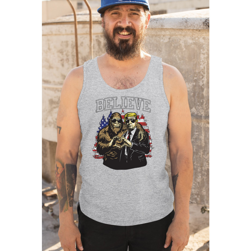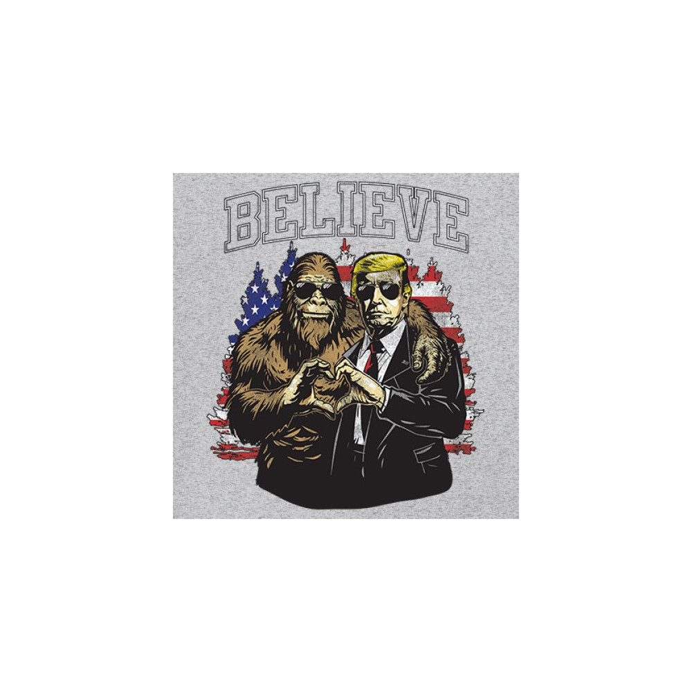 The "Believe" design combines patriotic pride and conservative values with a touch of fun. Featuring Donald J. Trump and a loyal Bigfoot against the American flag, this graphic is perfect for Trump supporters, Republicans, and believers in America First. Celebrate the Red Wave, the 47th President, and the unstoppable fight for victory. Ideal for anyone with unwavering belief in the people's mandate.