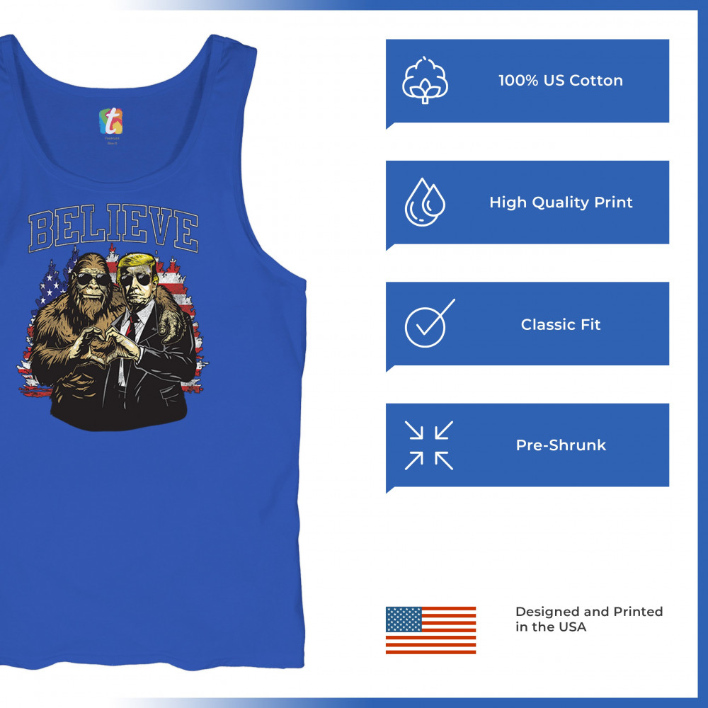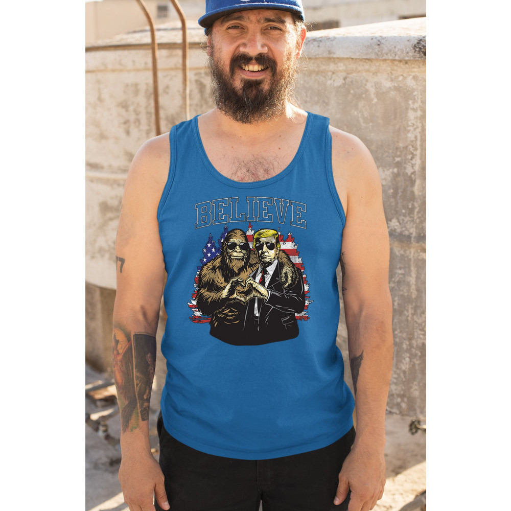 The "Believe" design combines patriotic pride and conservative values with a touch of fun. Featuring Donald J. Trump and a loyal Bigfoot against the American flag, this graphic is perfect for Trump supporters, Republicans, and believers in America First. Celebrate the Red Wave, the 47th President, and the unstoppable fight for victory. Ideal for anyone with unwavering belief in the people's mandate.
