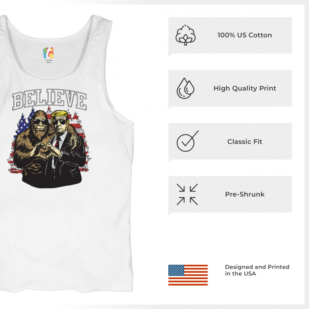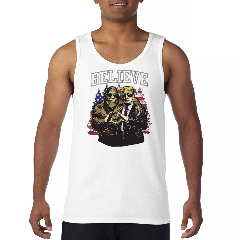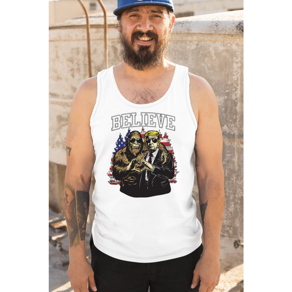 The "Believe" design combines patriotic pride and conservative values with a touch of fun. Featuring Donald J. Trump and a loyal Bigfoot against the American flag, this graphic is perfect for Trump supporters, Republicans, and believers in America First. Celebrate the Red Wave, the 47th President, and the unstoppable fight for victory. Ideal for anyone with unwavering belief in the people's mandate.