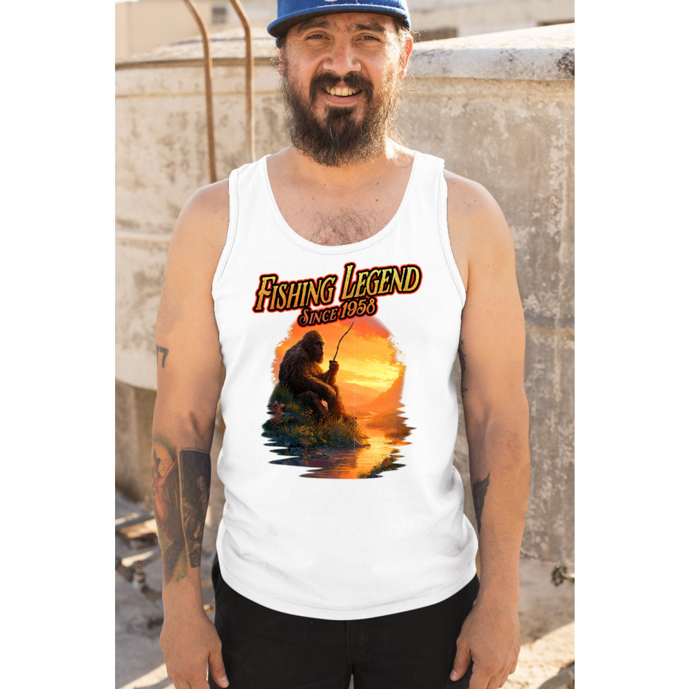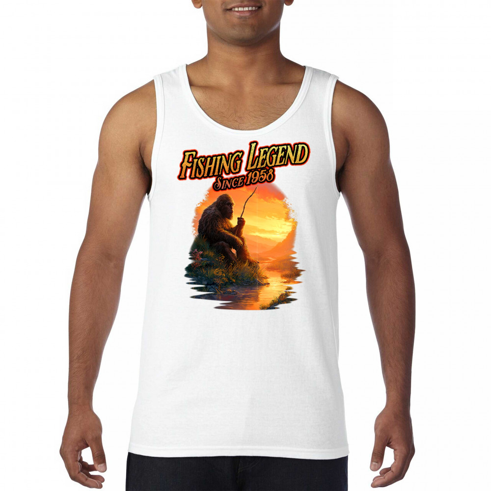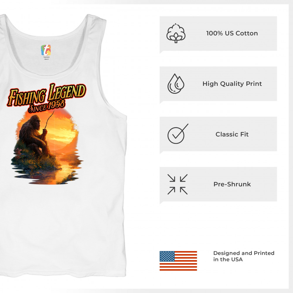 Bigfoot fishing legend design with Sasquatch lifestyle, retro vintage humor, funny wilderness shirt, Father’s Day gift, and campfire style.