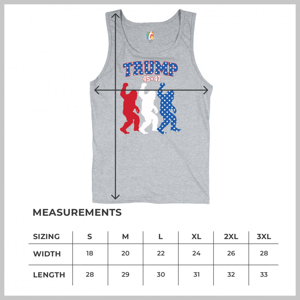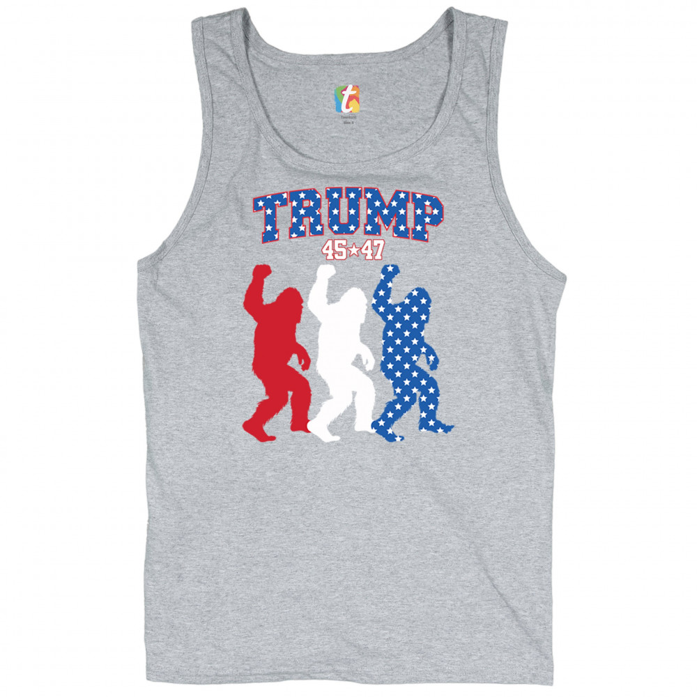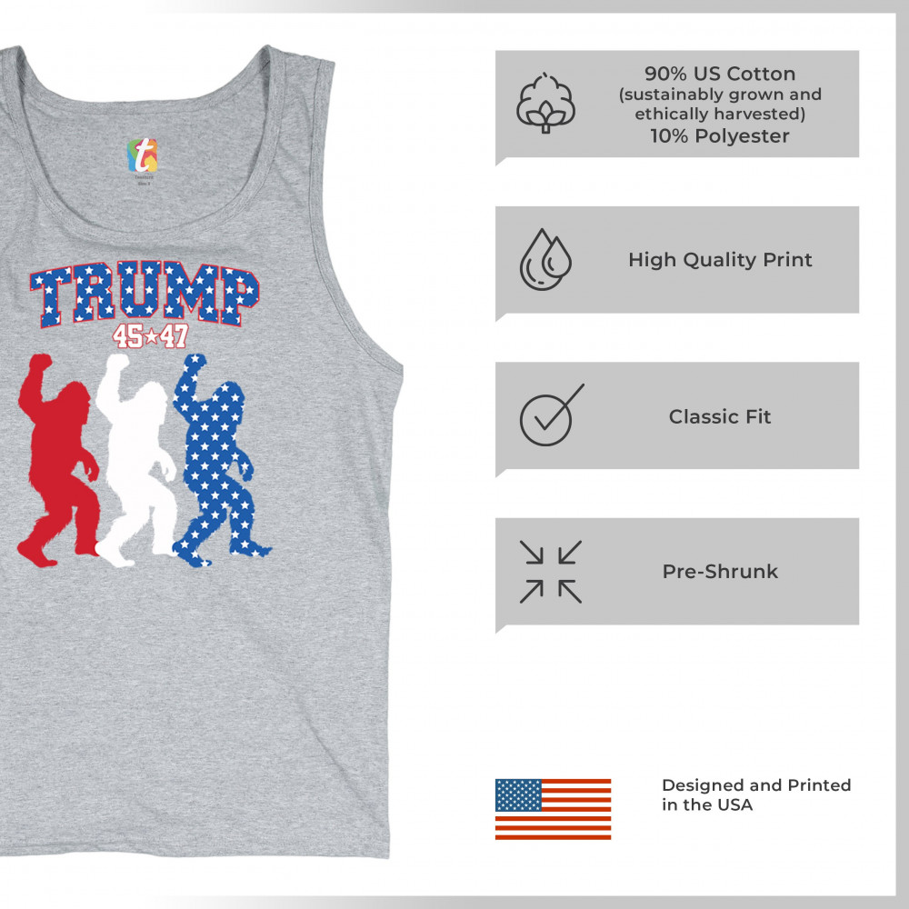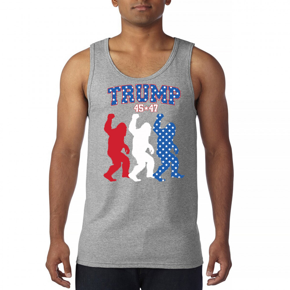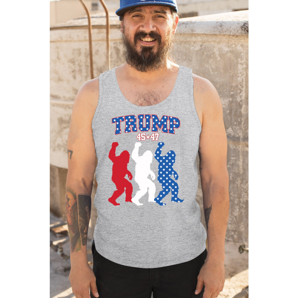 Unite humor and patriotism with the Trump 45/47 Bigfoot design! Featuring bold red, white, and blue Bigfoot silhouettes adorned with American flag stars, this eye-catching design supports Donald J. Trump, the Republican party, and the Red Wave movement. Embrace the fight for common sense, America First, and the people's mandate with this unique and fun statement piece.