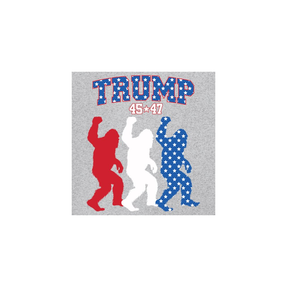 Trump 45/47 Bigfoot design in red, white, and blue with American flag stars. Celebrate patriotism, humor, and the fight for America First values.