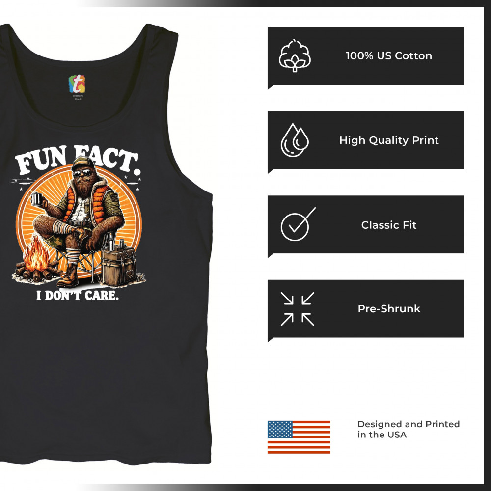 Funny Bigfoot Fun Fact design with cryptid humor, sarcastic outdoors shirt vibe, retro Sasquatch saying, USA pride, and camping adventure style.