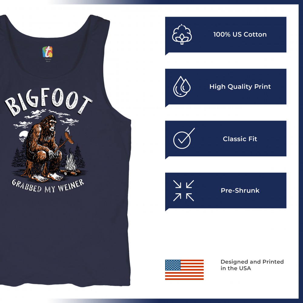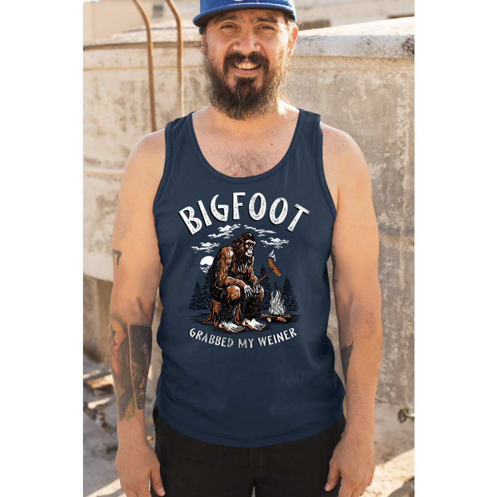 The Bigfoot Grabbed My Weiner design brings cheeky campfire humor to your outdoor adventures. Featuring a cartoon-style Sasquatch roasting a sausage by the fire, it’s perfect for cryptid lovers, campers, and jokesters. Ideal for BBQs, bonfires, forest festivals, and anyone who enjoys weiner jokes with their wilderness.