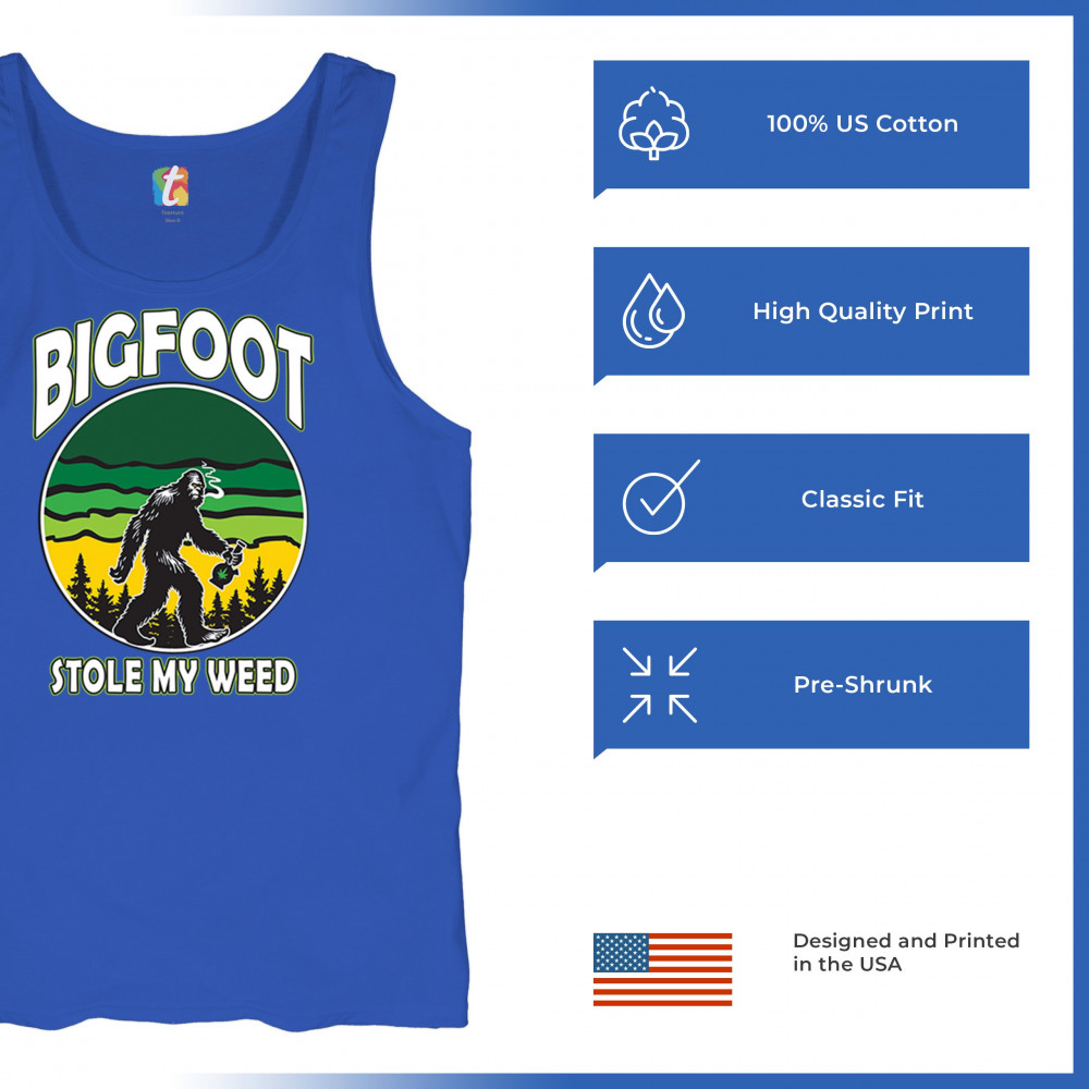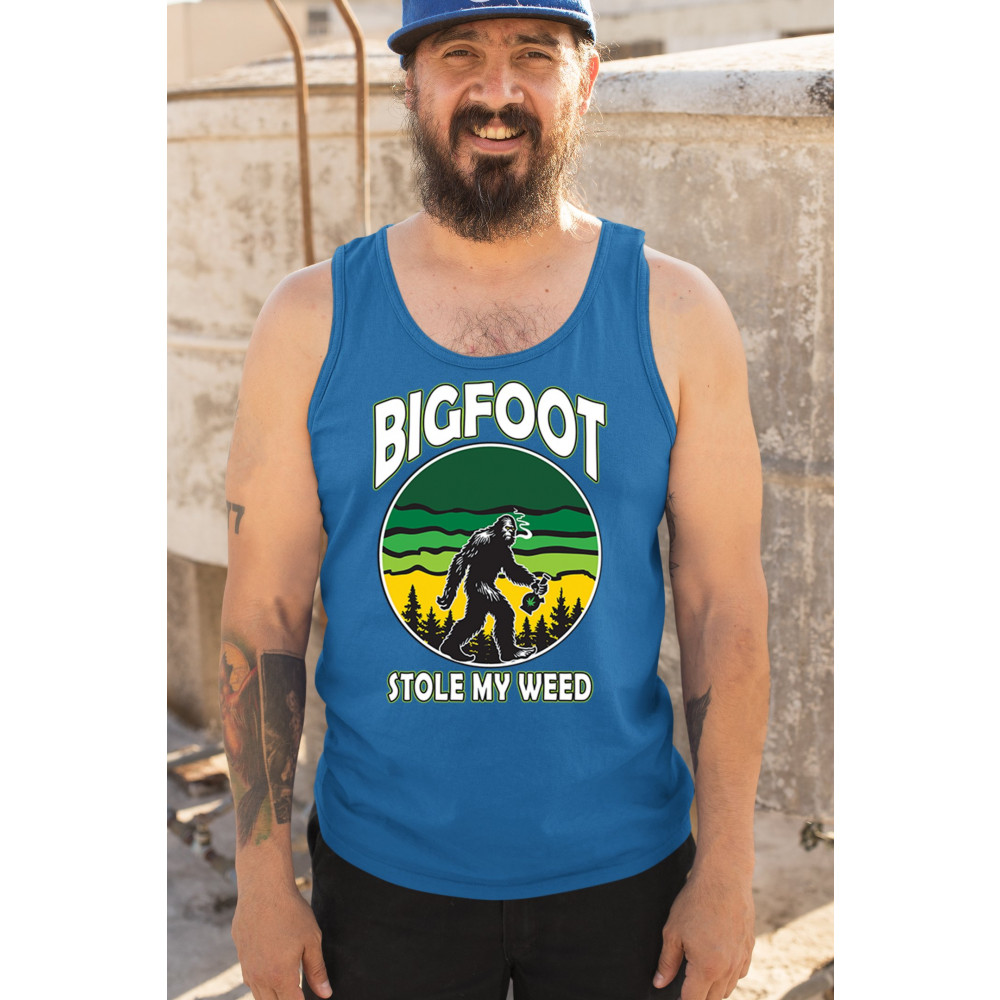 Humorous "Bigfoot Stole My Weed" design featuring Bigfoot and a cannabis leaf. Perfect for fans of Mary Jane, stoned humor, and a chill lifestyle.