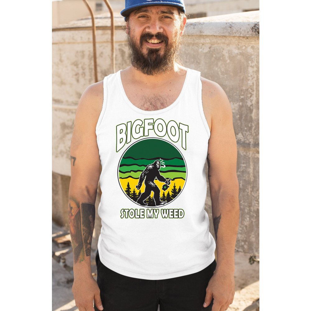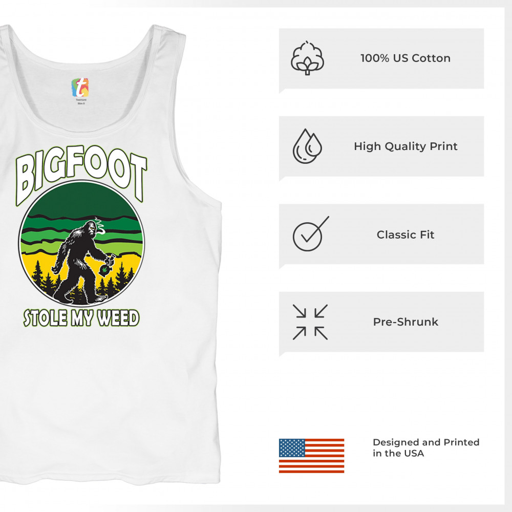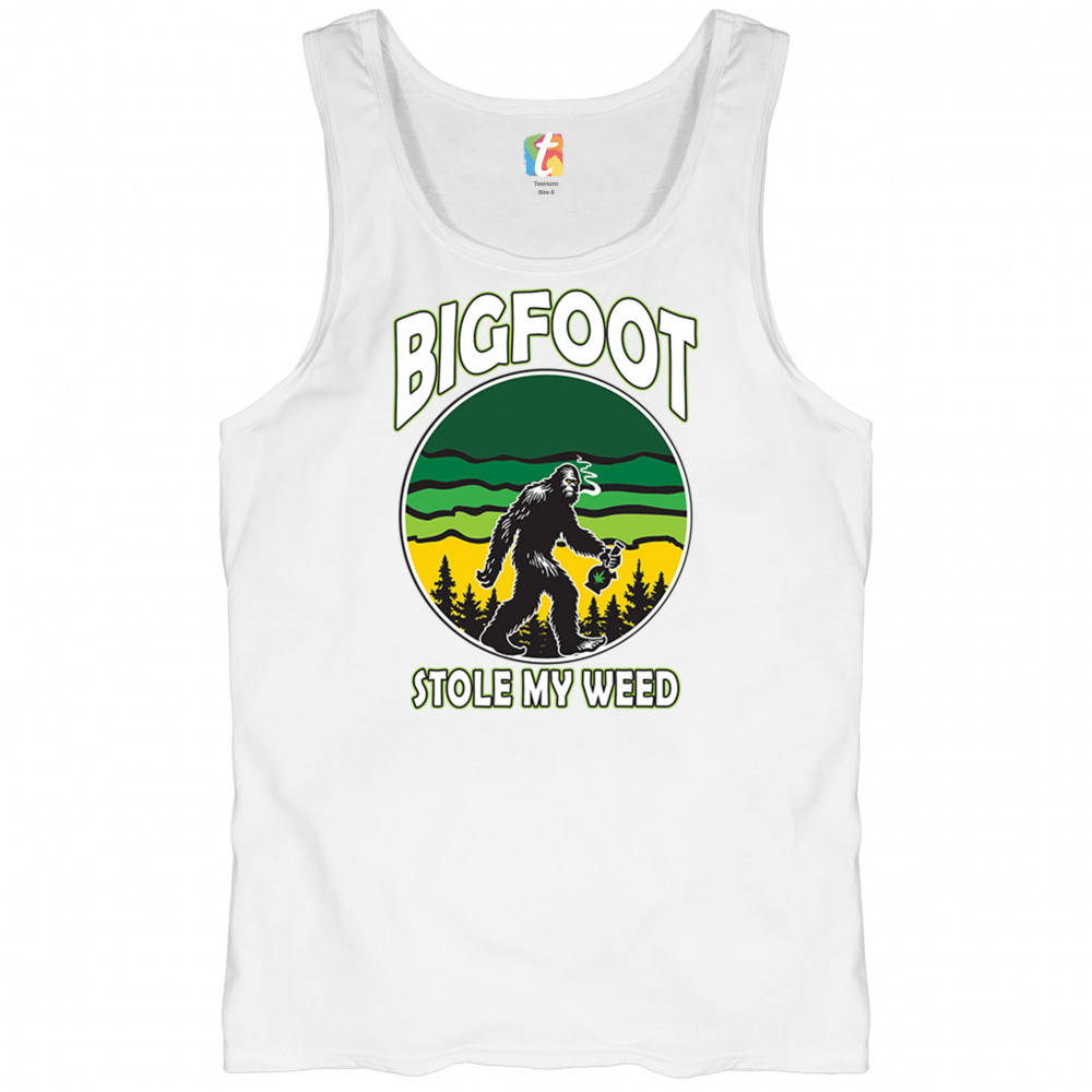 Humorous "Bigfoot Stole My Weed" design featuring Bigfoot and a cannabis leaf. Perfect for fans of Mary Jane, stoned humor, and a chill lifestyle.