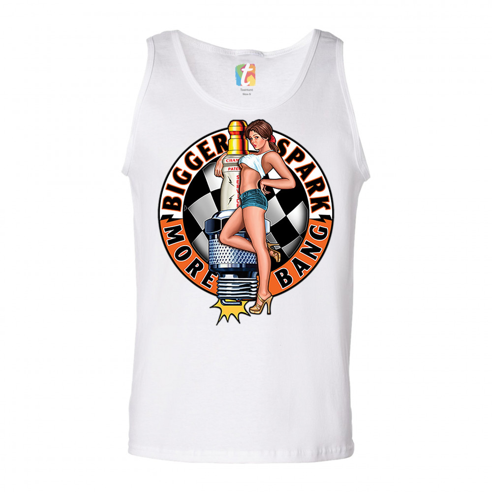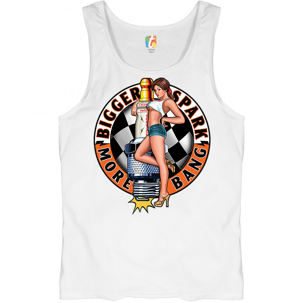 BIGGER SPARK MORE BANG tank top pin-up girl vintage automotive men's top white