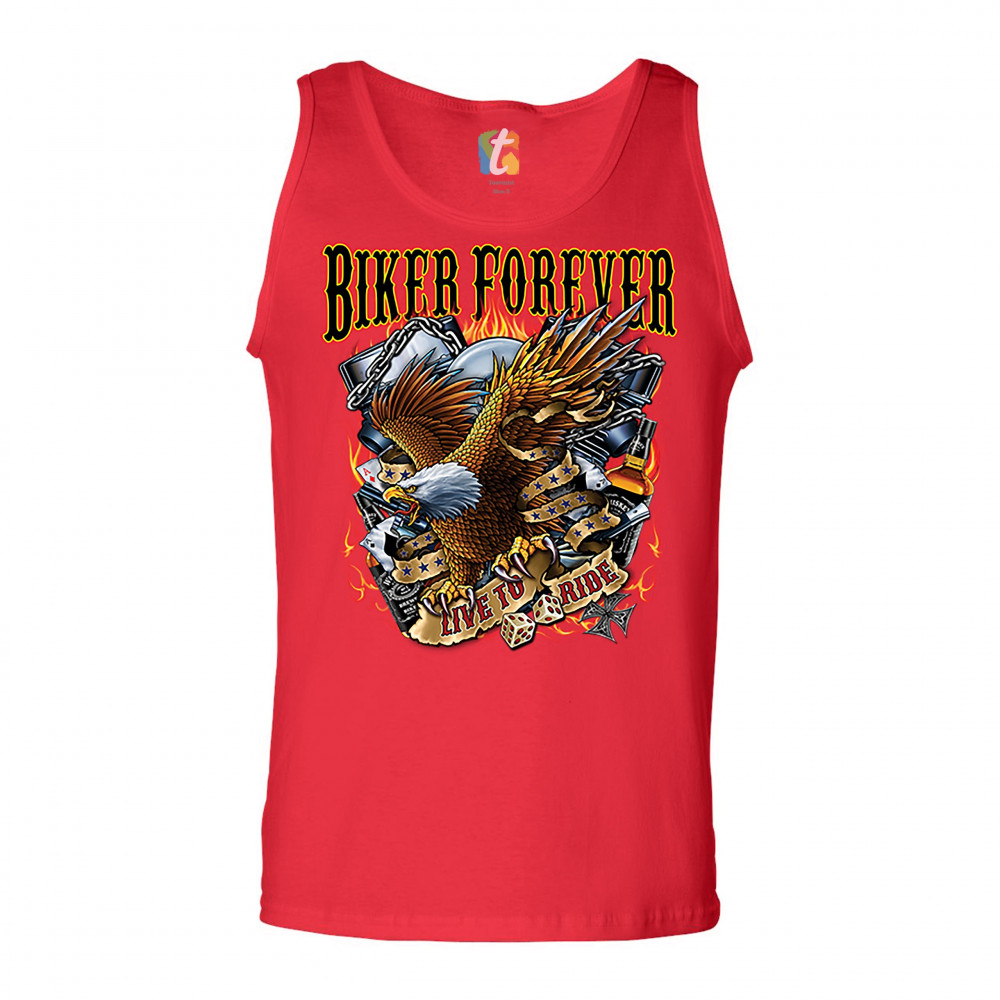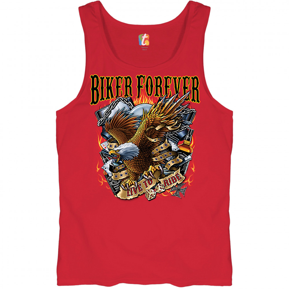 A print featuring an American bald eagle, holding a stripe with "live to ride" written on it, a v-engine in the background, a pair of dice and playing cards. At the top the print says: "biker forever". A great choice for a motorcycle enthusiast.