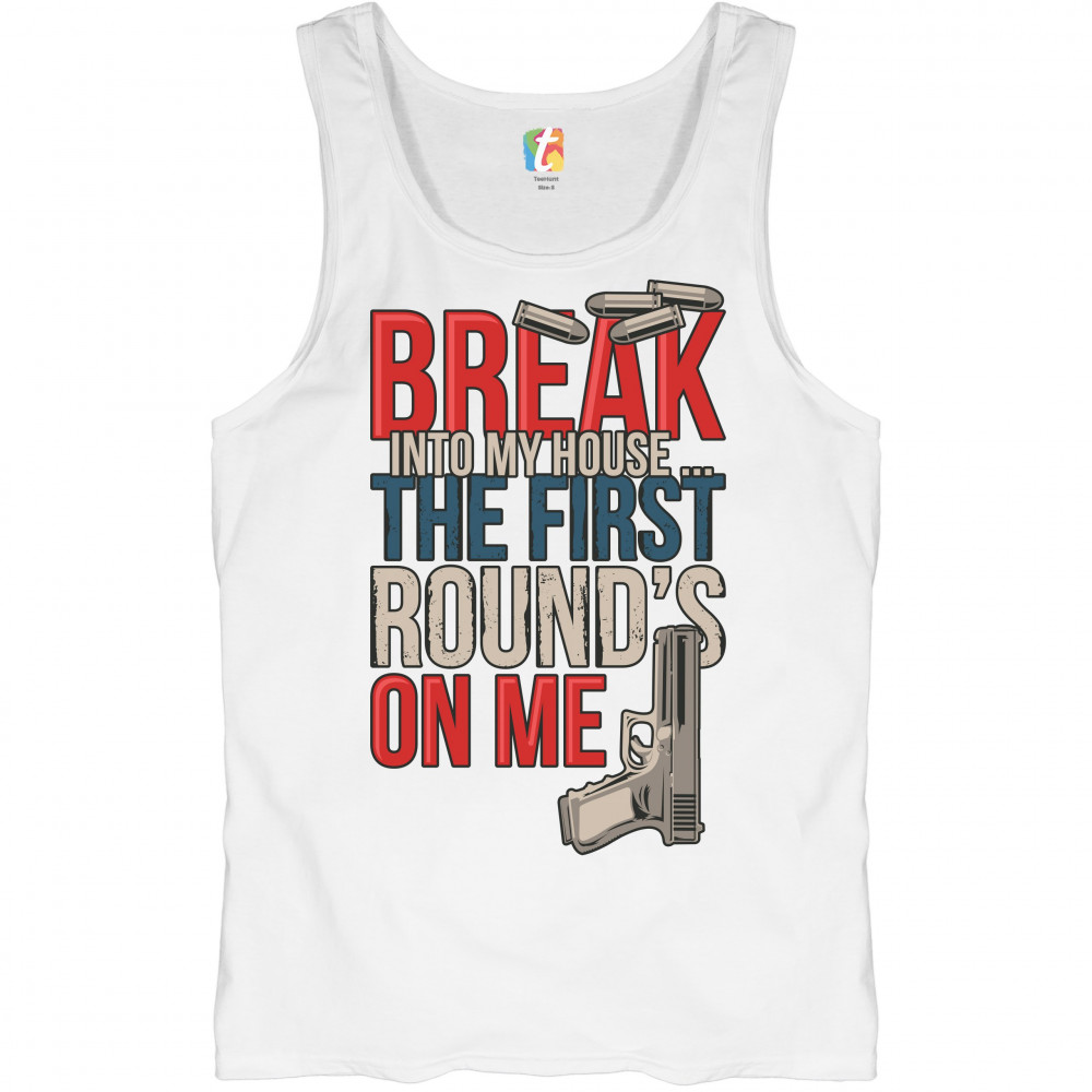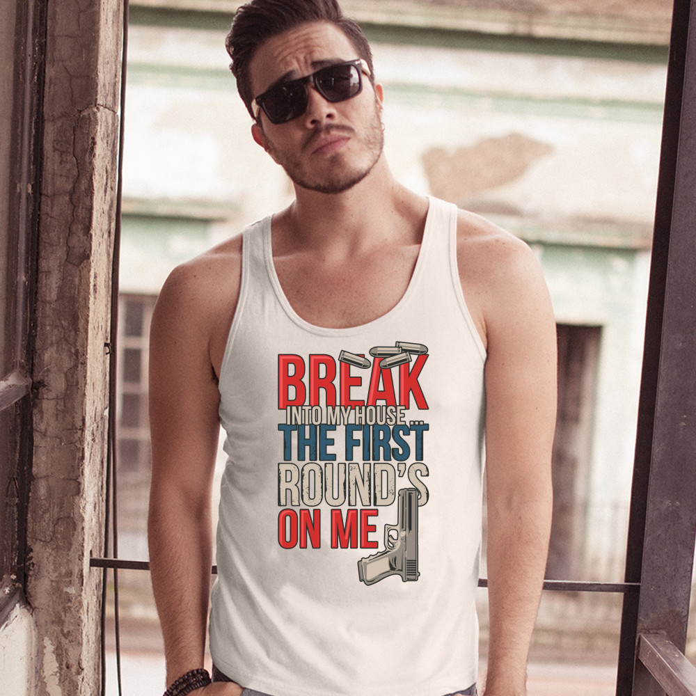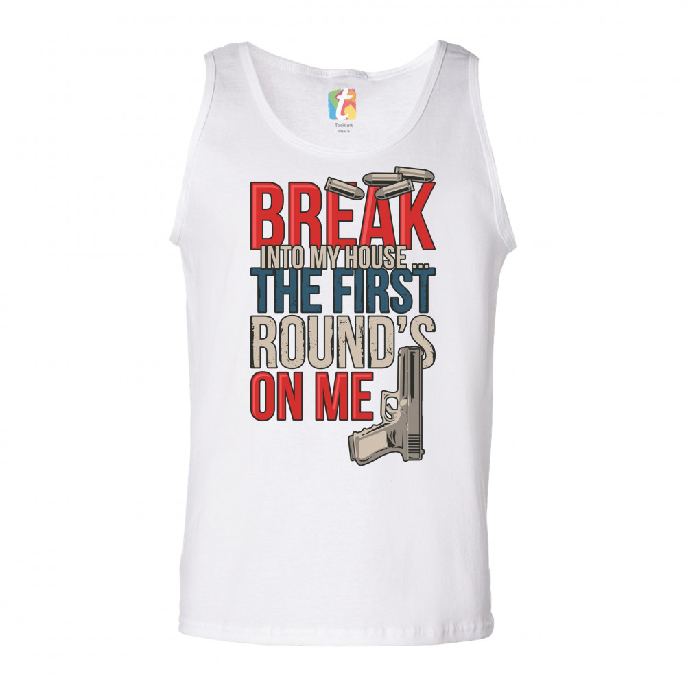 BREAK INTO MY HOUSE.. THE FIRST ROUND'S ON ME tank top 2nd amendment men's top white