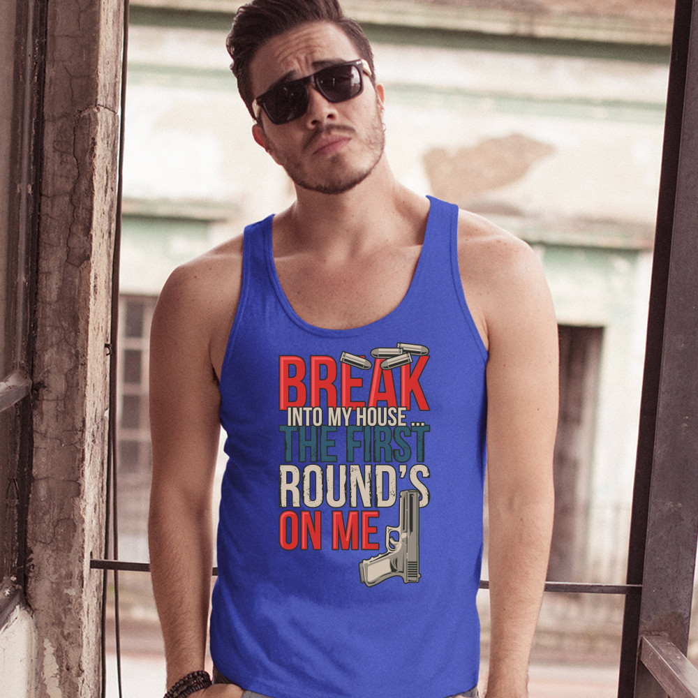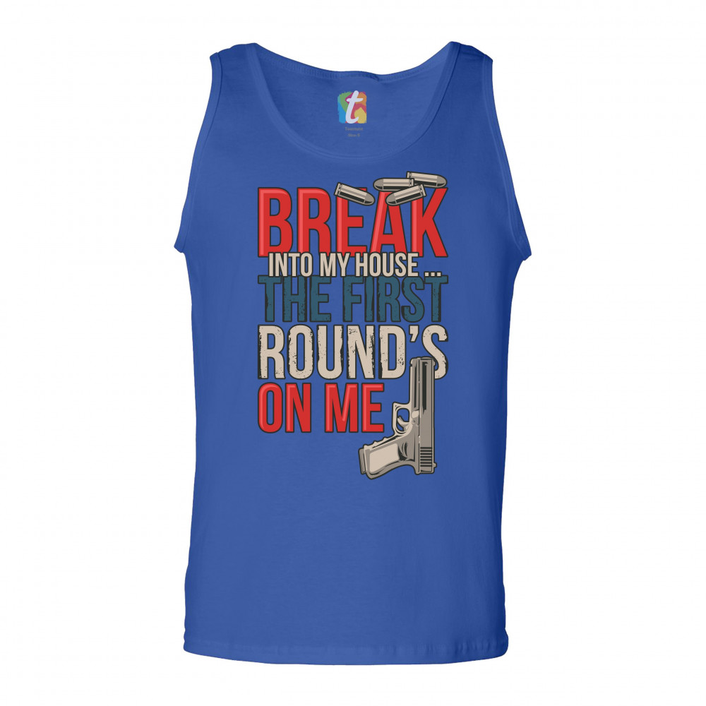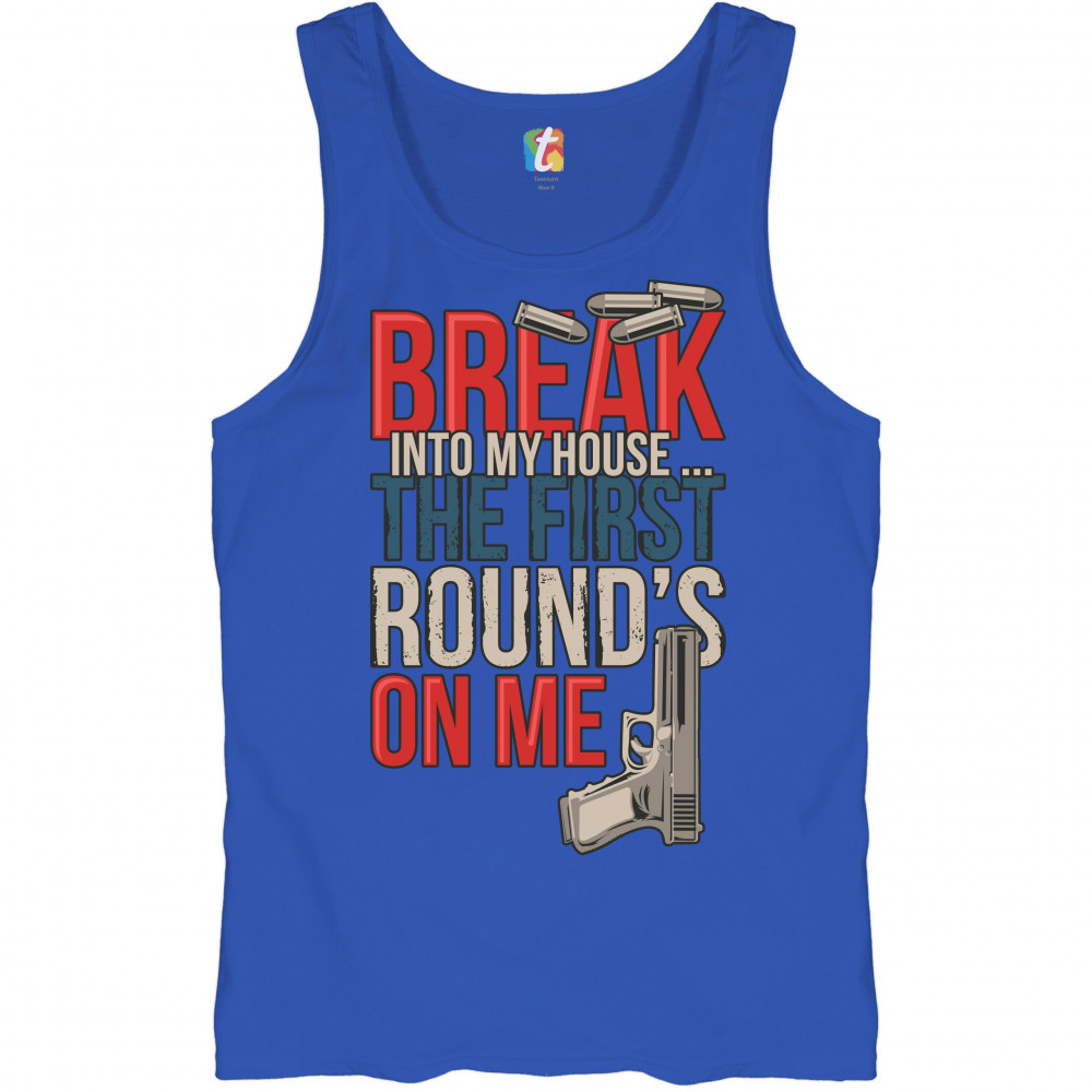 BREAK INTO MY HOUSE.. THE FIRST ROUND'S ON ME tank top 2nd amendment men's top royal blue