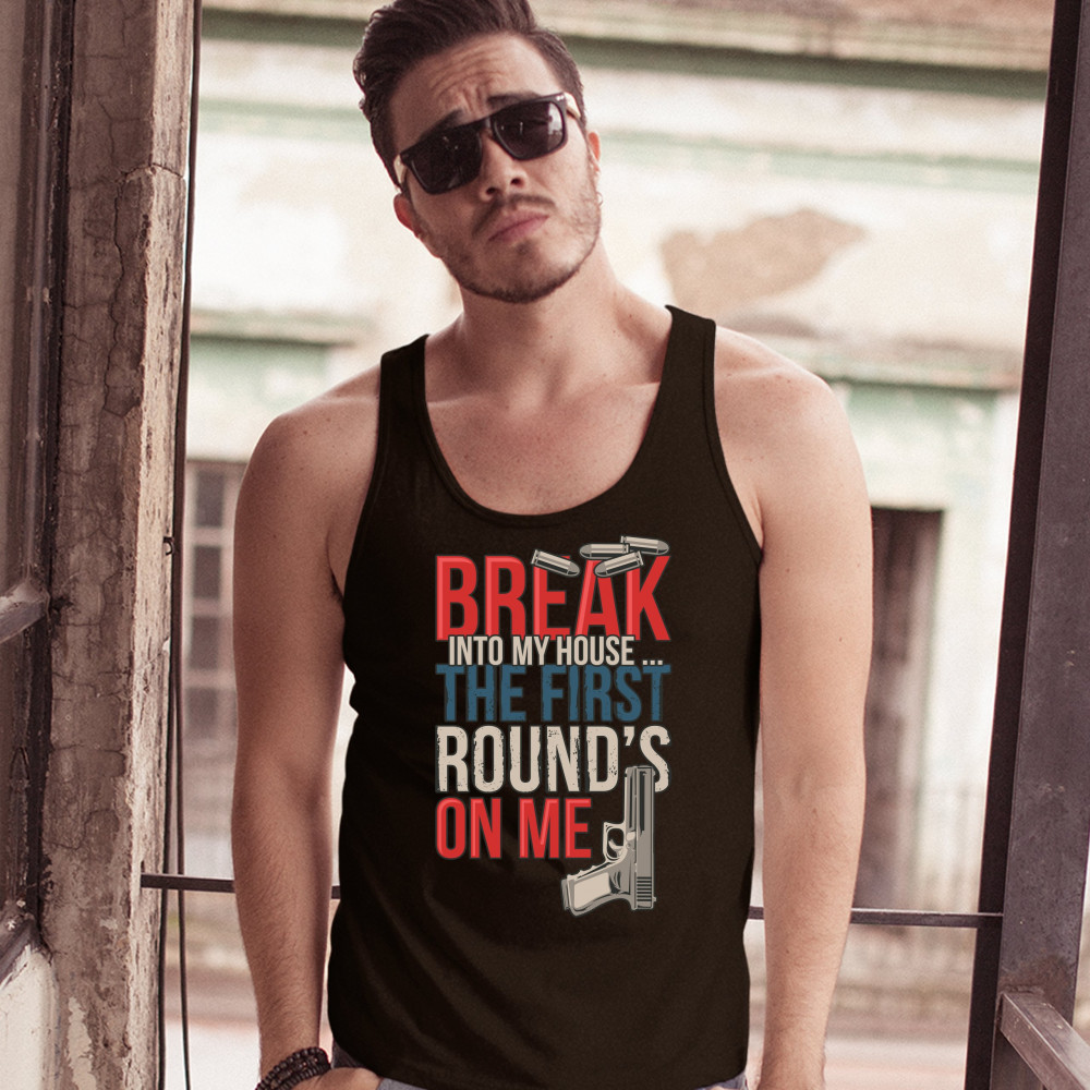 BREAK INTO MY HOUSE.. THE FIRST ROUND'S ON ME tank top 2nd amendment men's top black