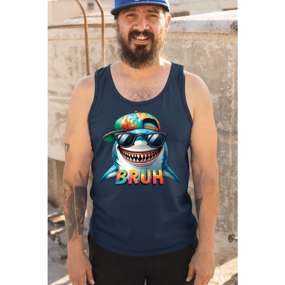Bruh Shark meme shirt with Gen Z humor, cartoon shark design, summer beach vibes, Sigma Aura, and Italian Brainrot internet humor.