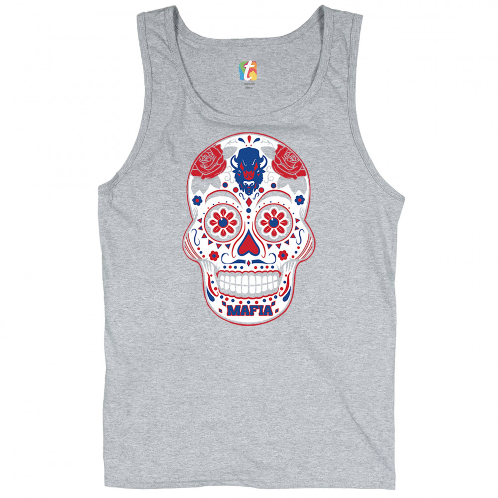Buffalo Sugar Skull with NY Bleed Blue pride, Northern Grit, Queen City football, playoff energy, and fantasy fan culture.