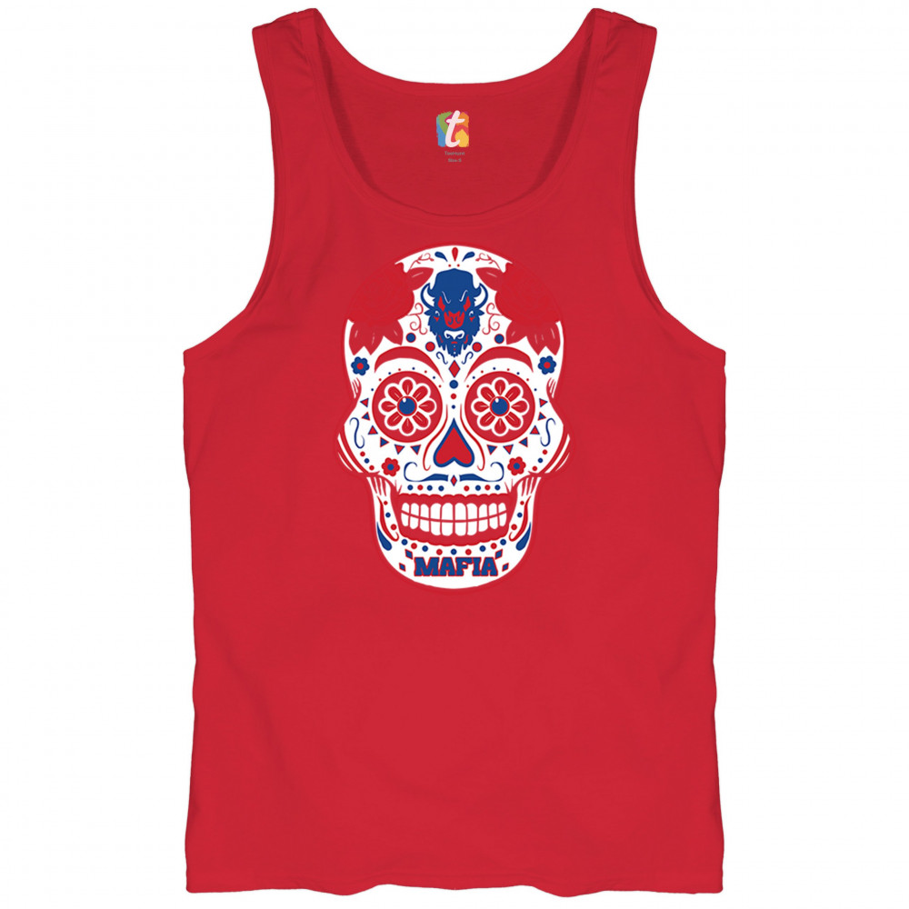Buffalo Sugar Skull with NY Bleed Blue pride, Northern Grit, Queen City football, playoff energy, and fantasy fan culture.