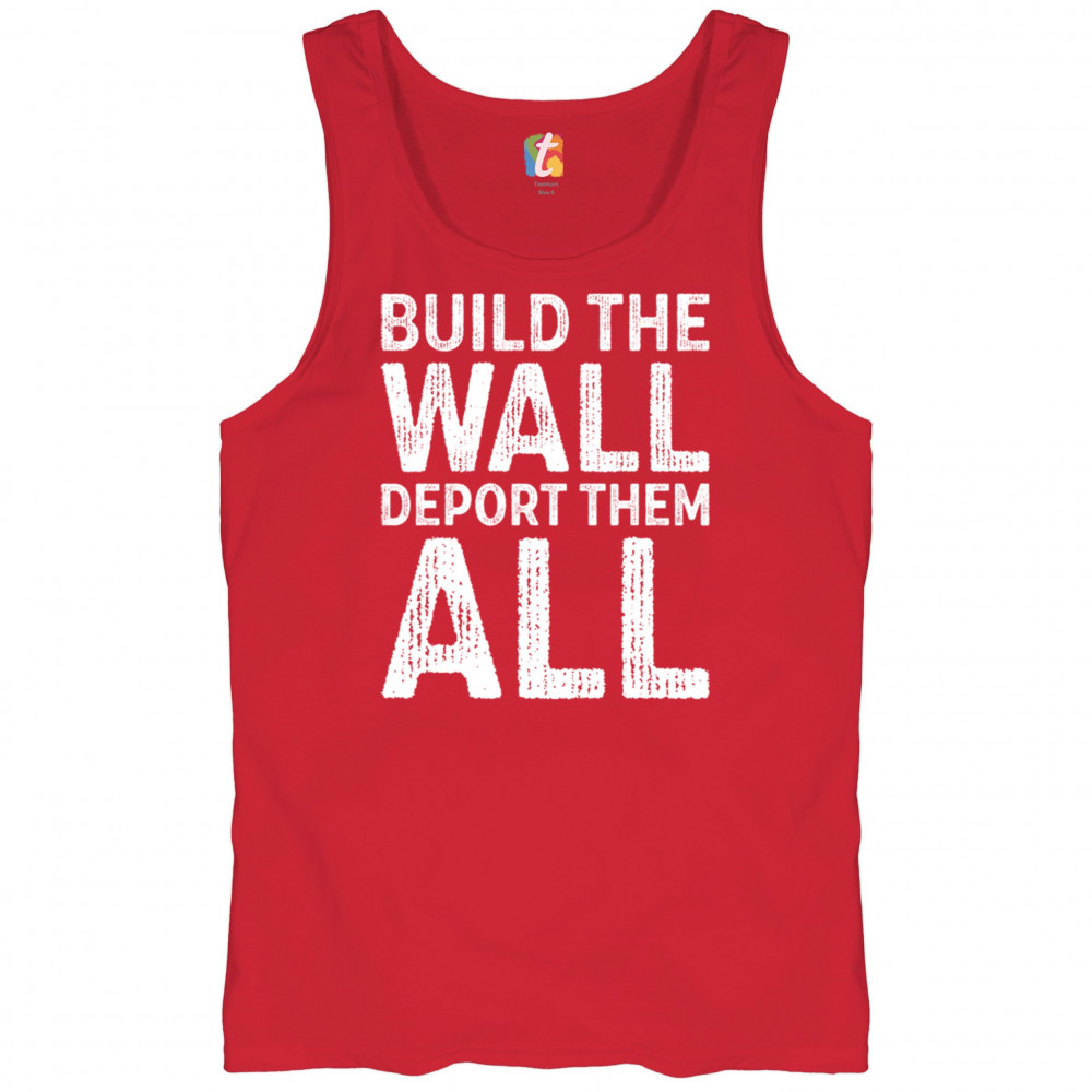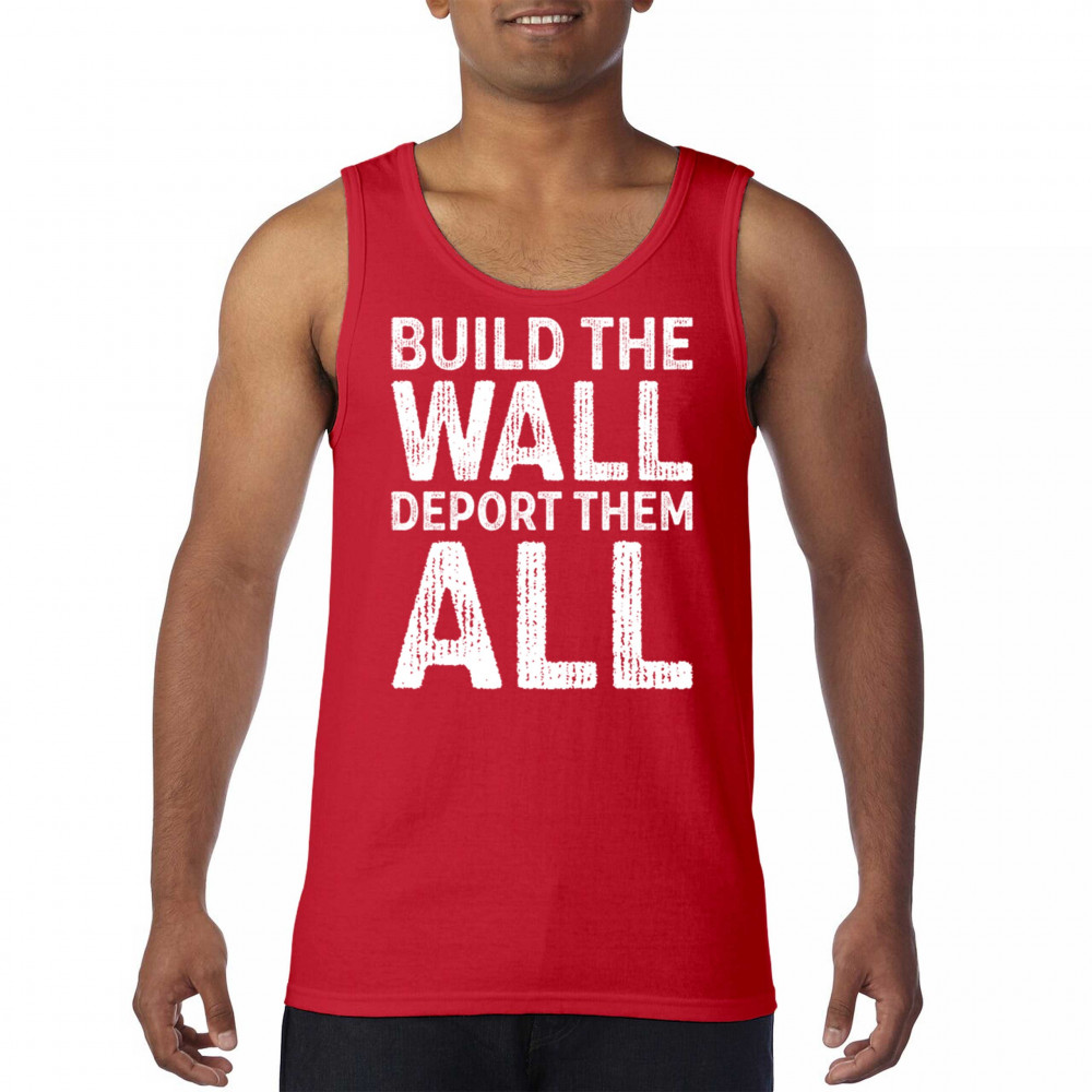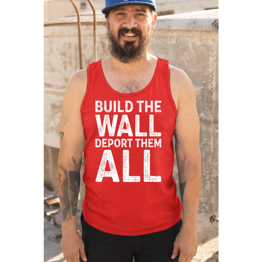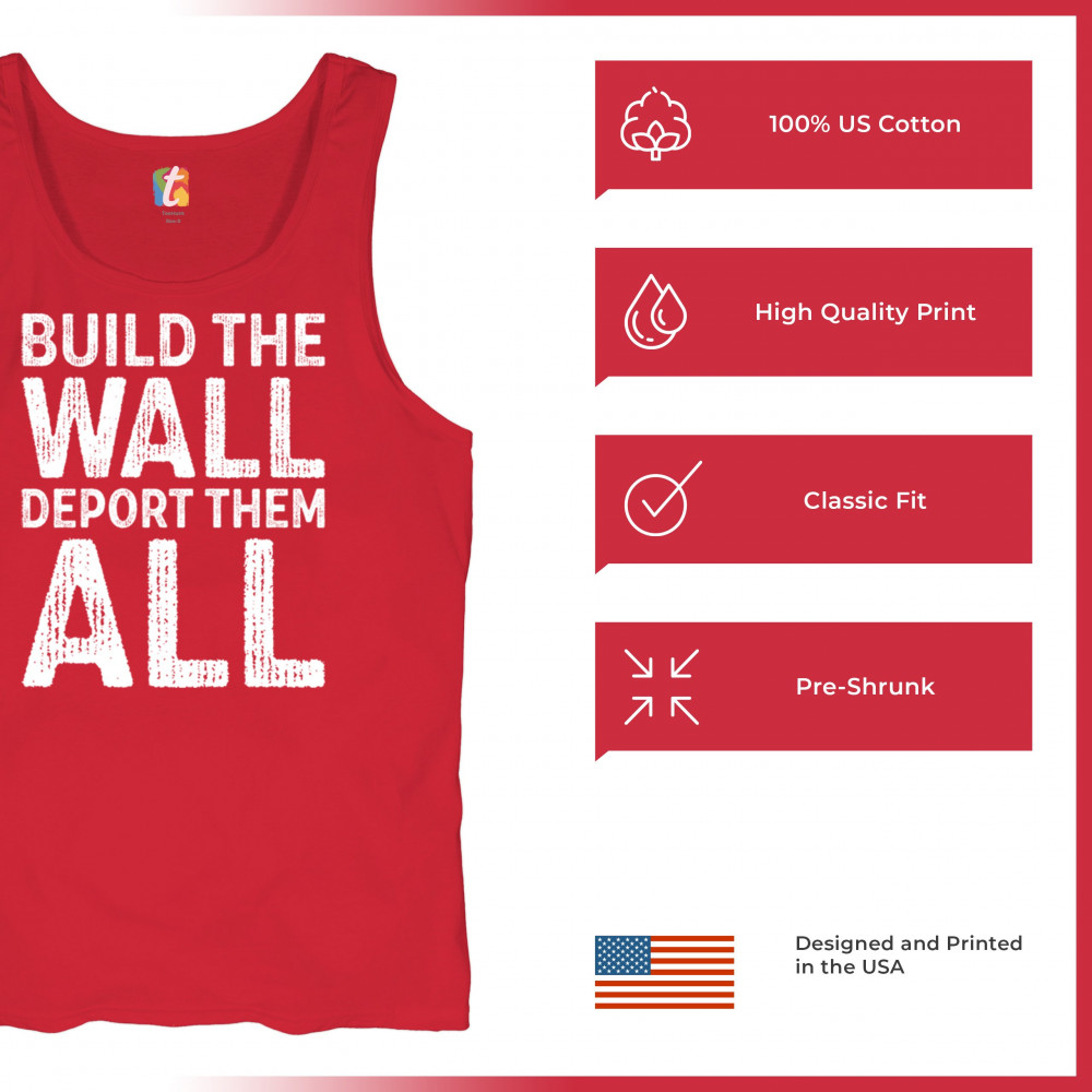 Stand strong for border security with our 'Build the Wall Deport Them All Trump 2024' tee. As a proud Trump supporter, join the America First movement and champion conservative values. Trust in God, not government, and reject the failed policies of Sleepy Joe. Let's go Brandon! Let the American flag wave high as we rally for victory in 2024.