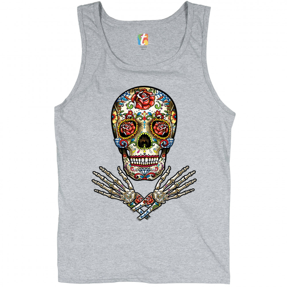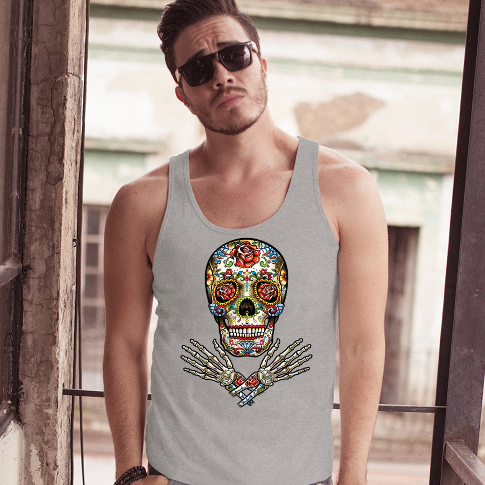 A huge print featuring a big calavera with roses in the eye sockets. There is a cross between the eyes and a huge rose on the forehead. Below the skull there are crossed arms. A great choice for anyone who upholds the traditions and celebrates the Day of