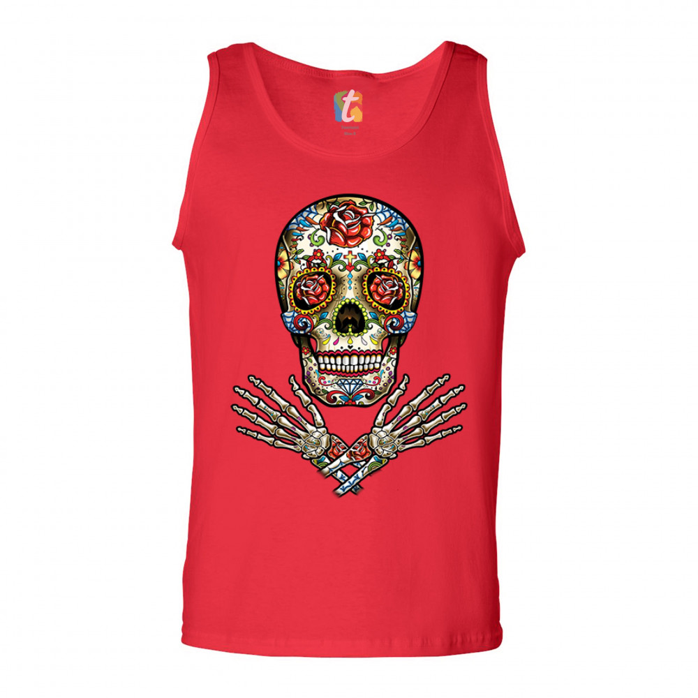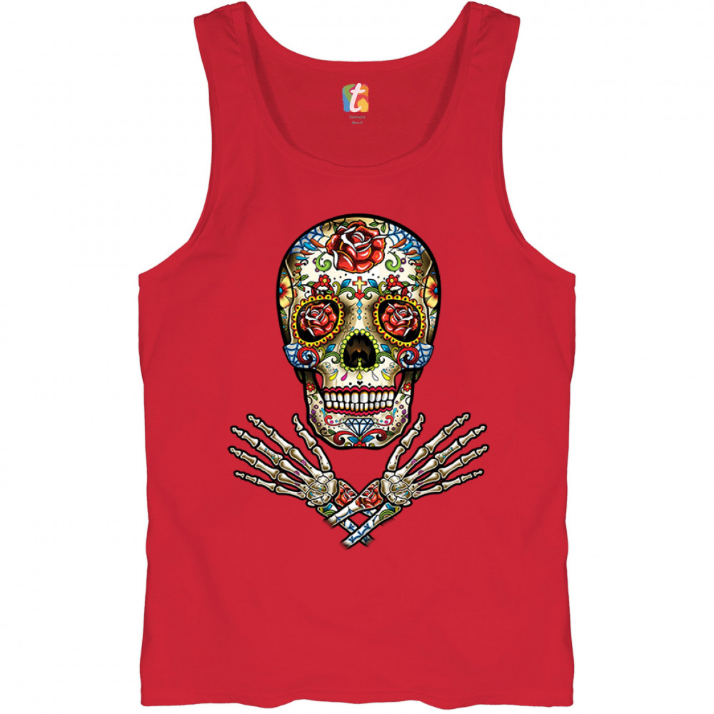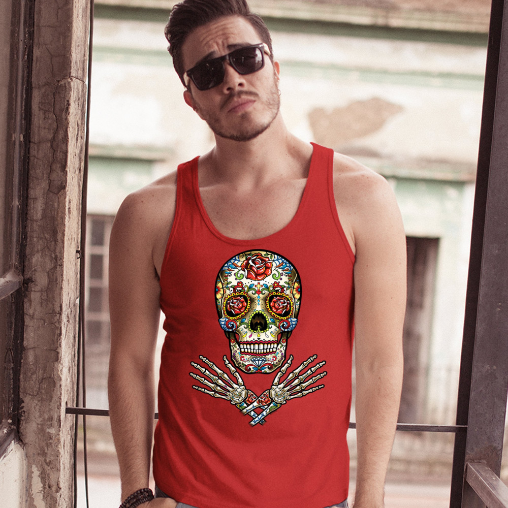 A huge print featuring a big calavera with roses in the eye sockets. There is a cross between the eyes and a huge rose on the forehead. Below the skull there are crossed arms. A great choice for anyone who upholds the traditions and celebrates the Day of