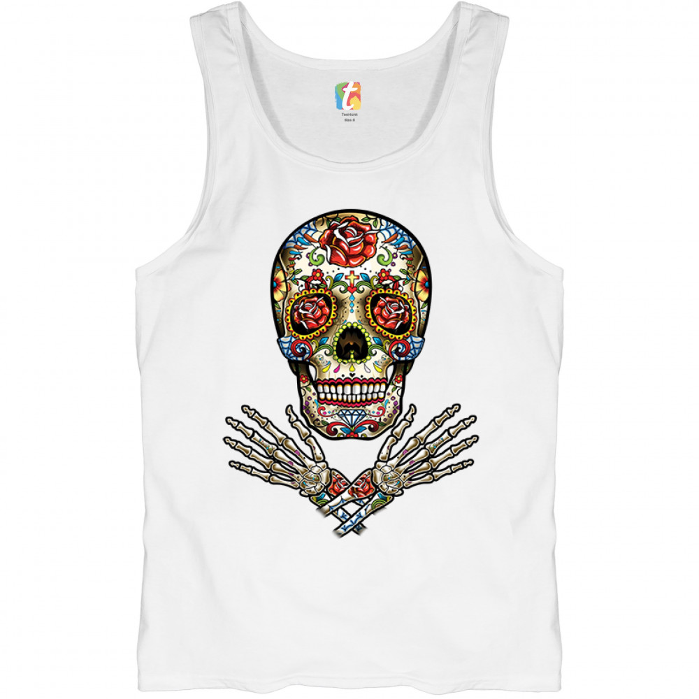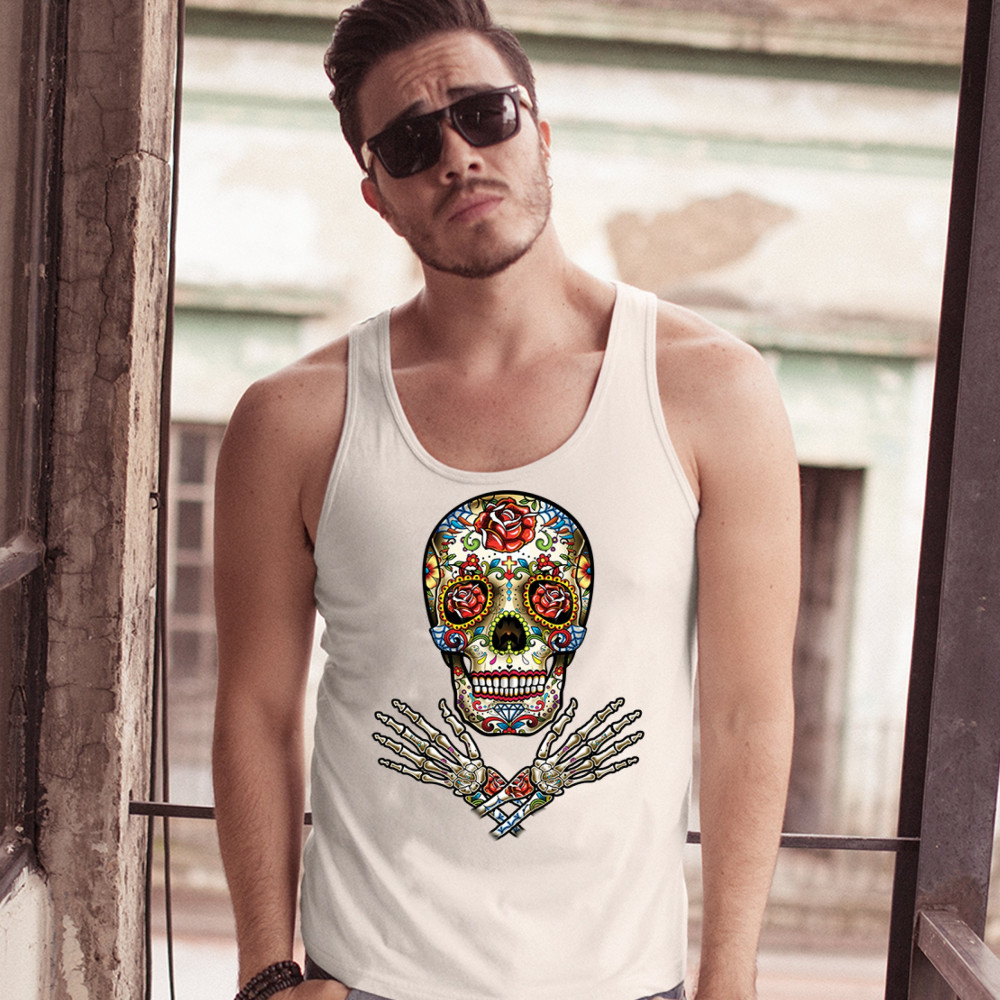 A huge print featuring a big calavera with roses in the eye sockets. There is a cross between the eyes and a huge rose on the forehead. Below the skull there are crossed arms. A great choice for anyone who upholds the traditions and celebrates the Day of