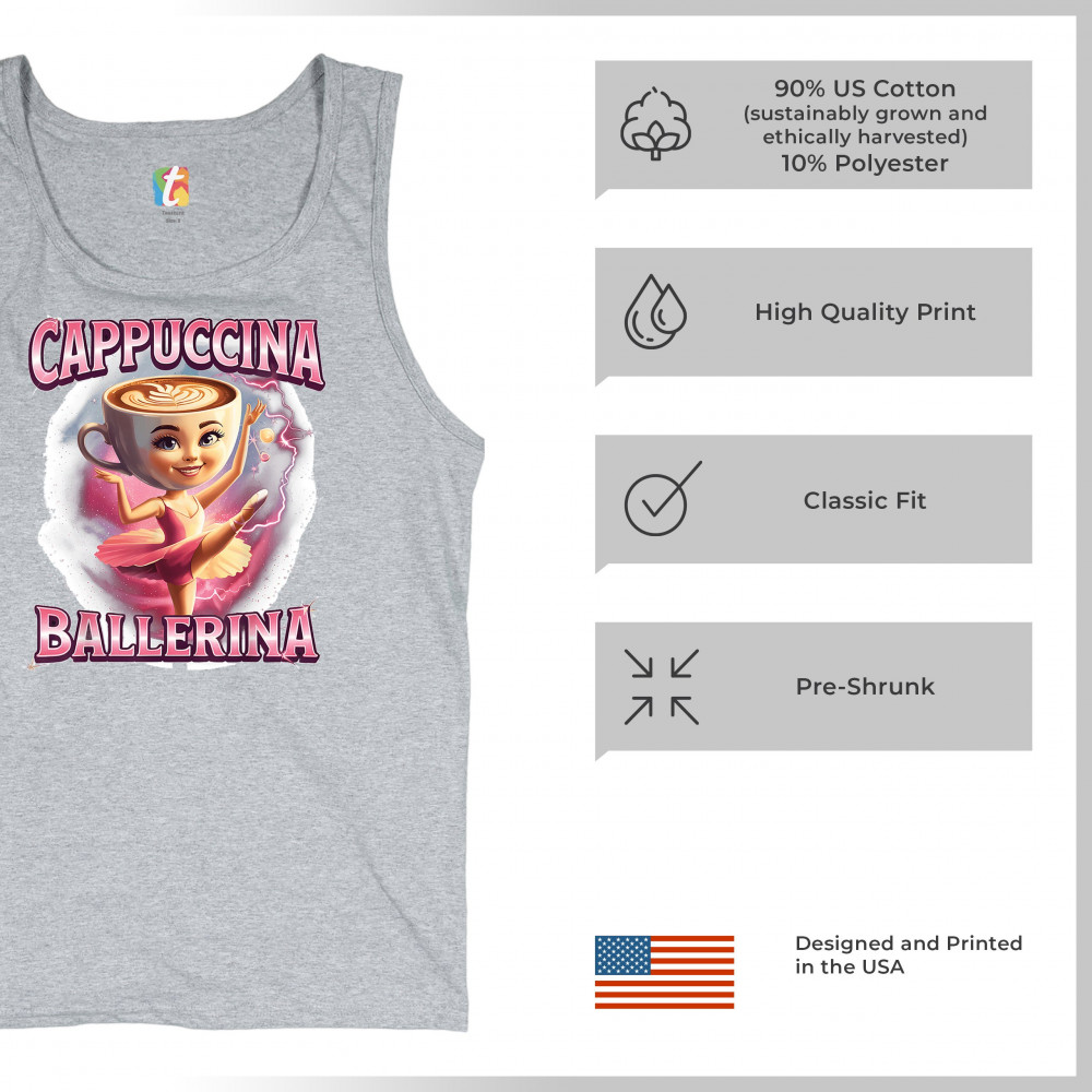Cappuccina Ballerina is your perfect mix of meme chaos and coffee-core fashion. This absurd design features a ballet-dancing cappuccino head with weirdcore flair and Gen Z humor. A surreal blend of ironic internet fashion, TikTok trends, and espresso madness—ideal for meme lovers, caffeine addicts, and viral absurdists alike.