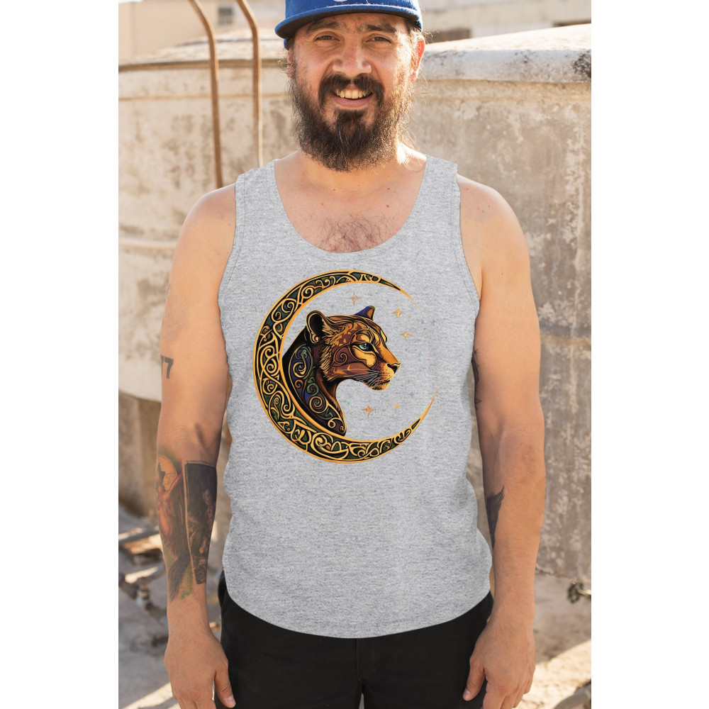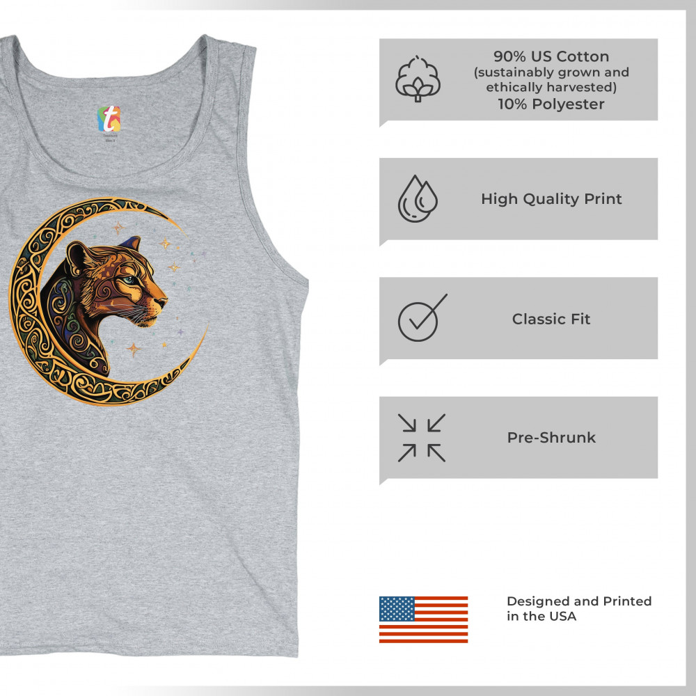 Mystical and elegant, this celestial leopard design merges wild animal strength with spiritual energy. Framed by a golden Celtic crescent moon and set against a starlit sky, it captures themes of nature, intuition, tribal symbolism, fantasy, and feminine power. Ideal for astrology fans, animal lovers, and seekers of cosmic connection.