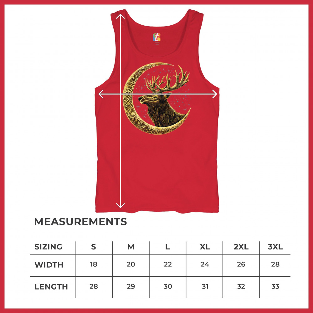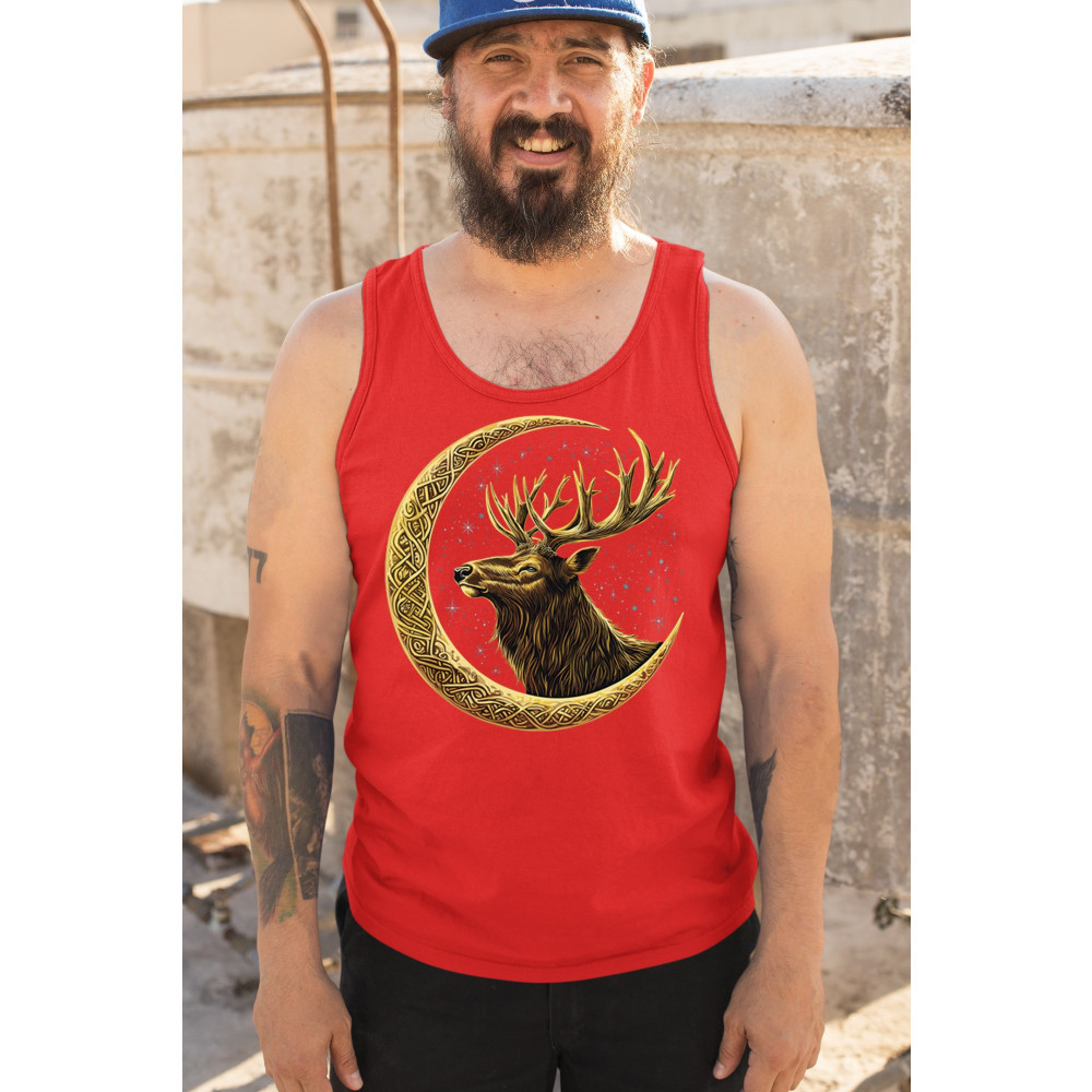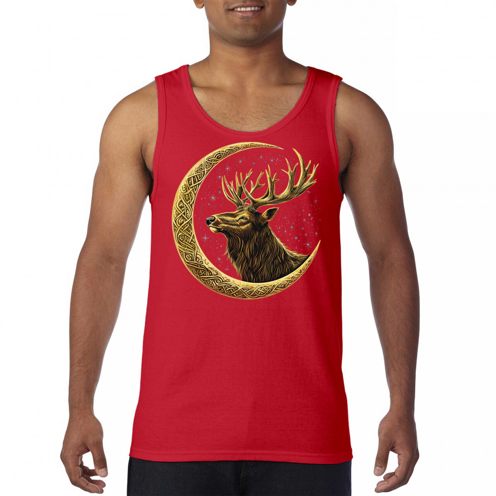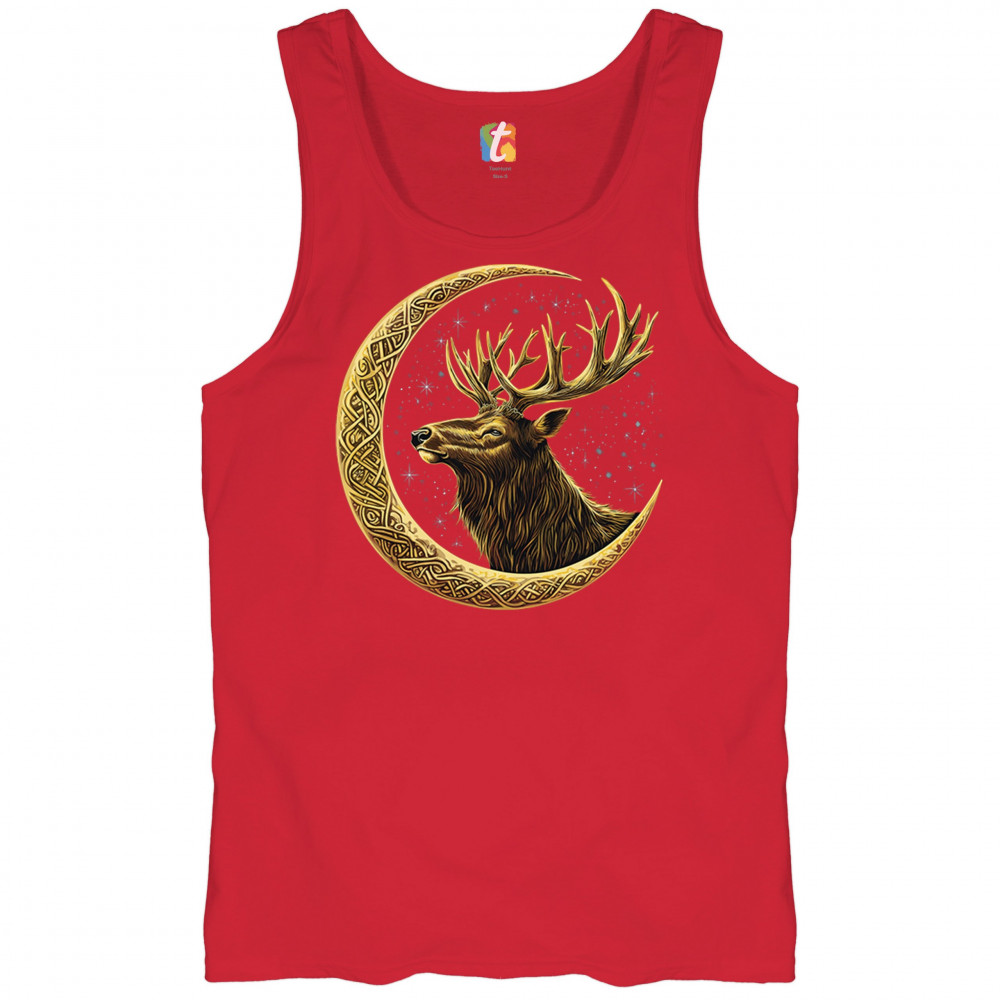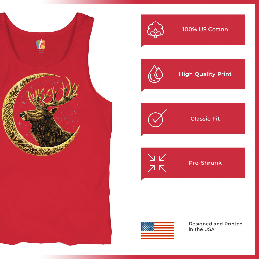 Celtic stag design with golden moon and cosmic stars. Symbolizes forest strength, leadership, and spiritual energy. Perfect for nature lovers.