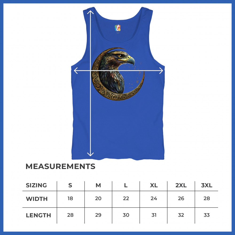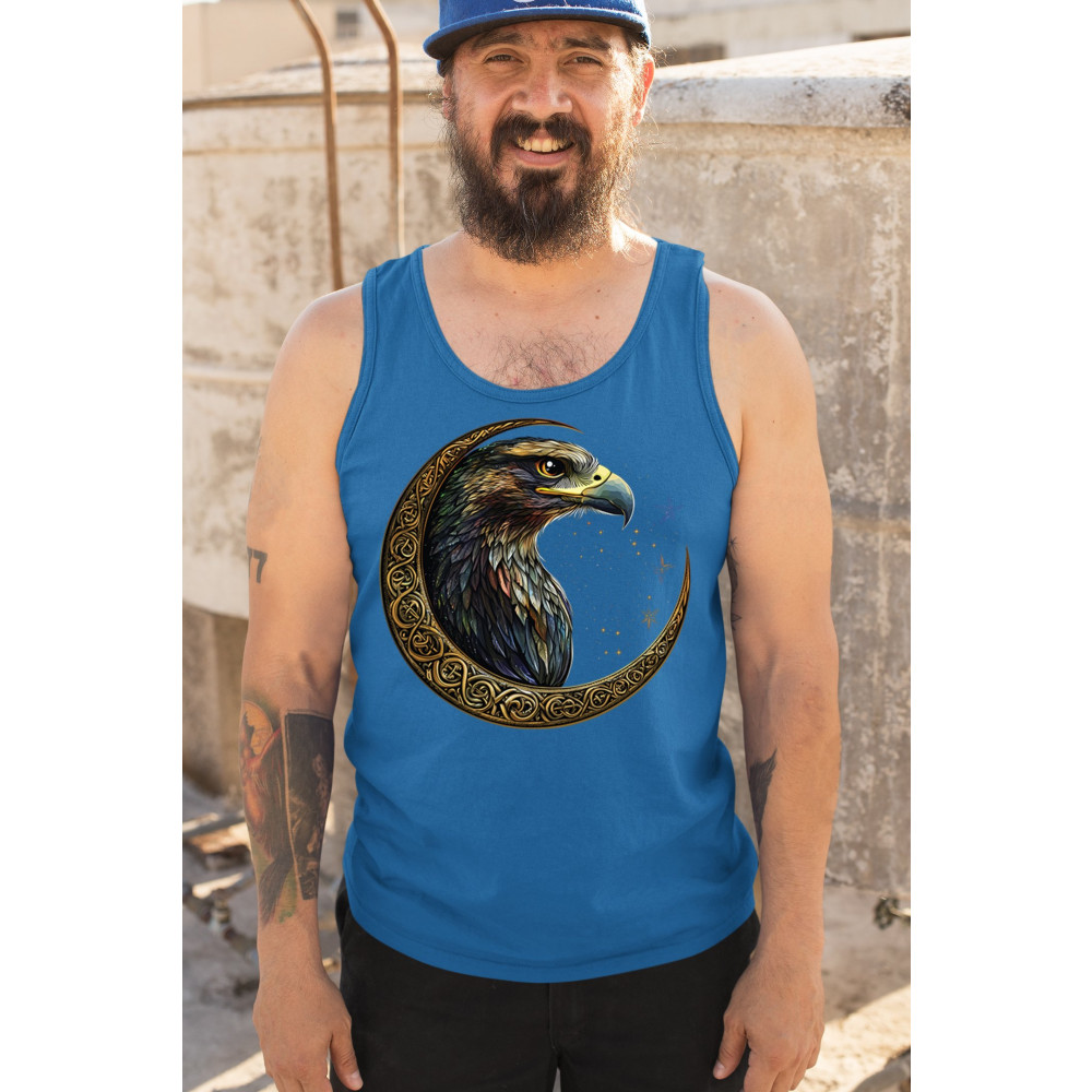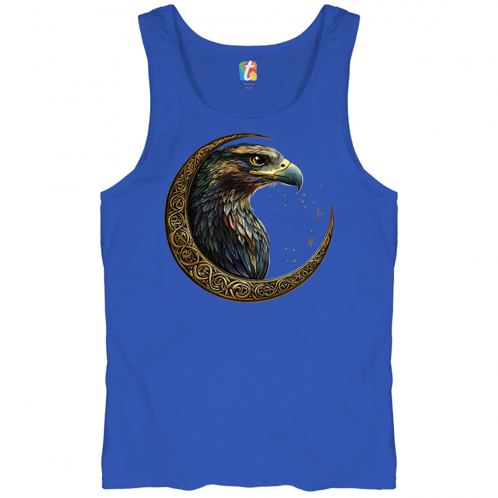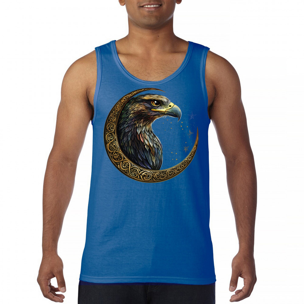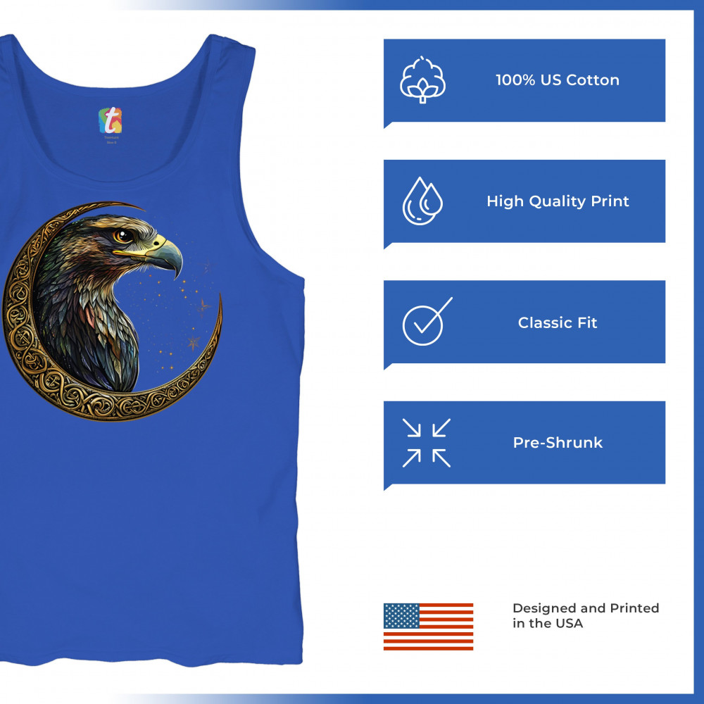 A beautifully detailed eagle with vibrant feathers is framed by a golden Celtic crescent moon and surrounded by a starry cosmic sky. This striking design represents freedom, spiritual power, and the mystery of the skies. Perfect for patriots, bird lovers, and those who connect with nature, tribal symbolism, and celestial art.