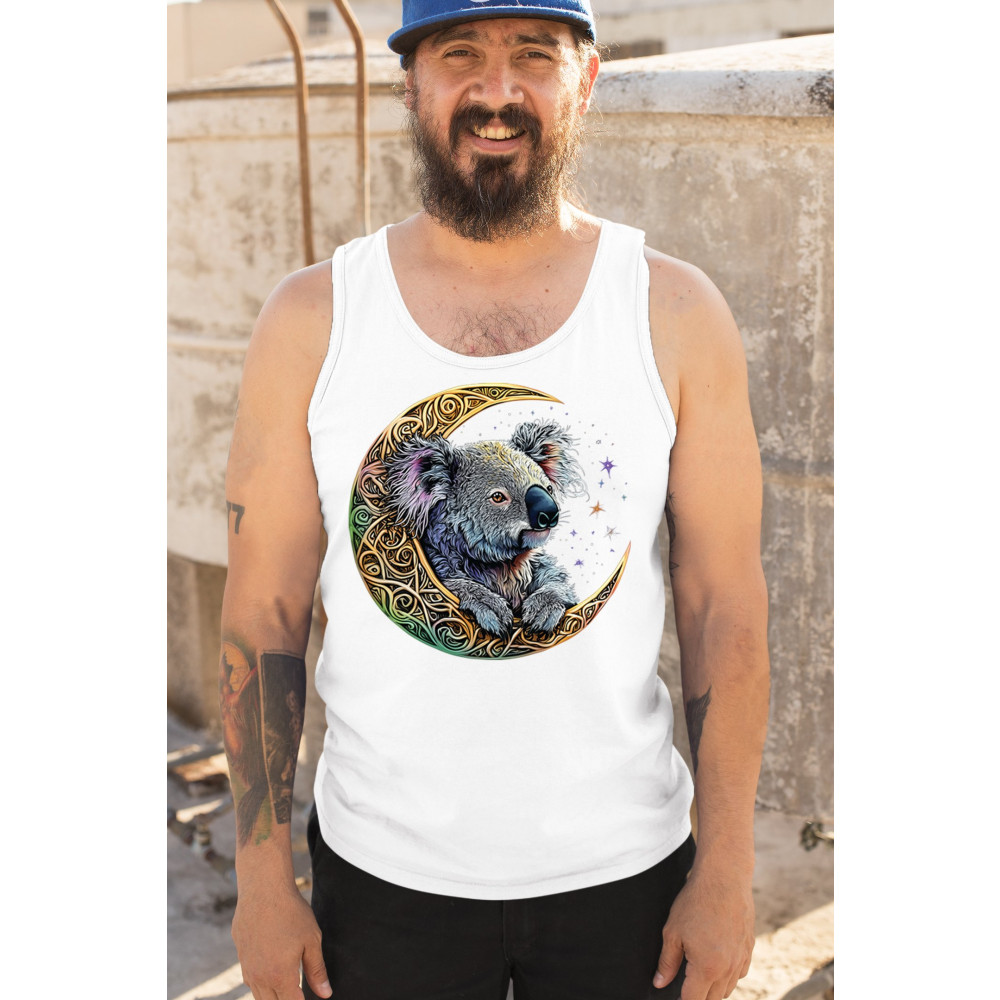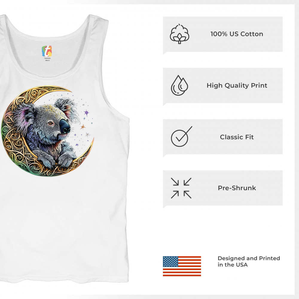 Koala resting in Celtic crescent moon with cosmic sky. A peaceful design for nature lovers, spiritual thinkers, and fantasy art fans.