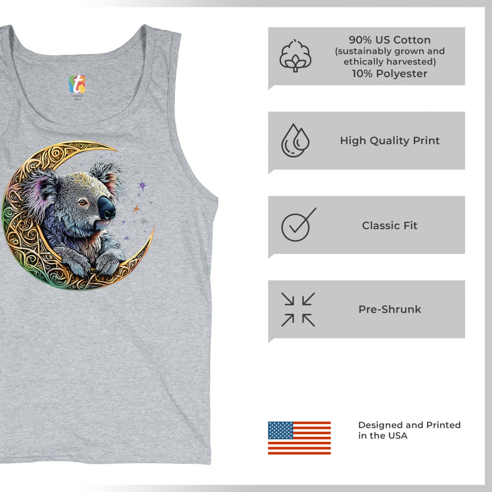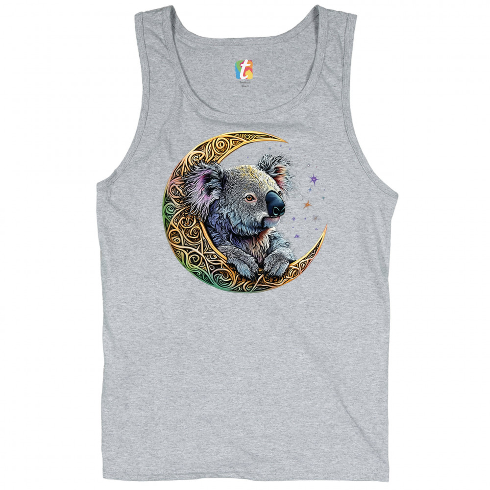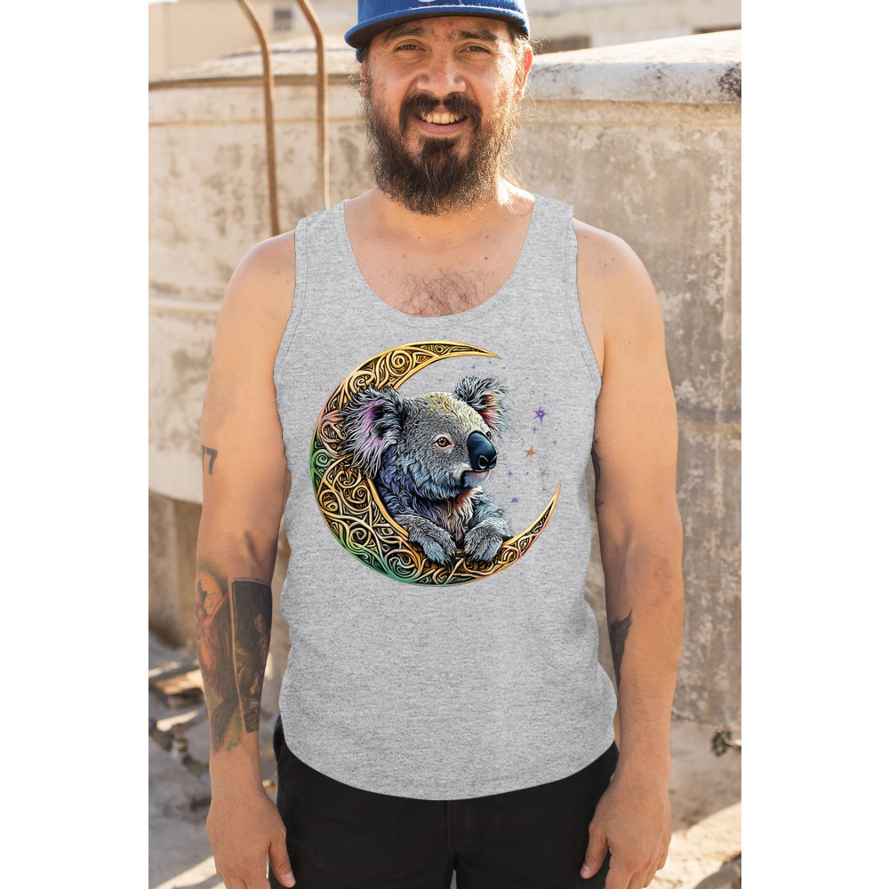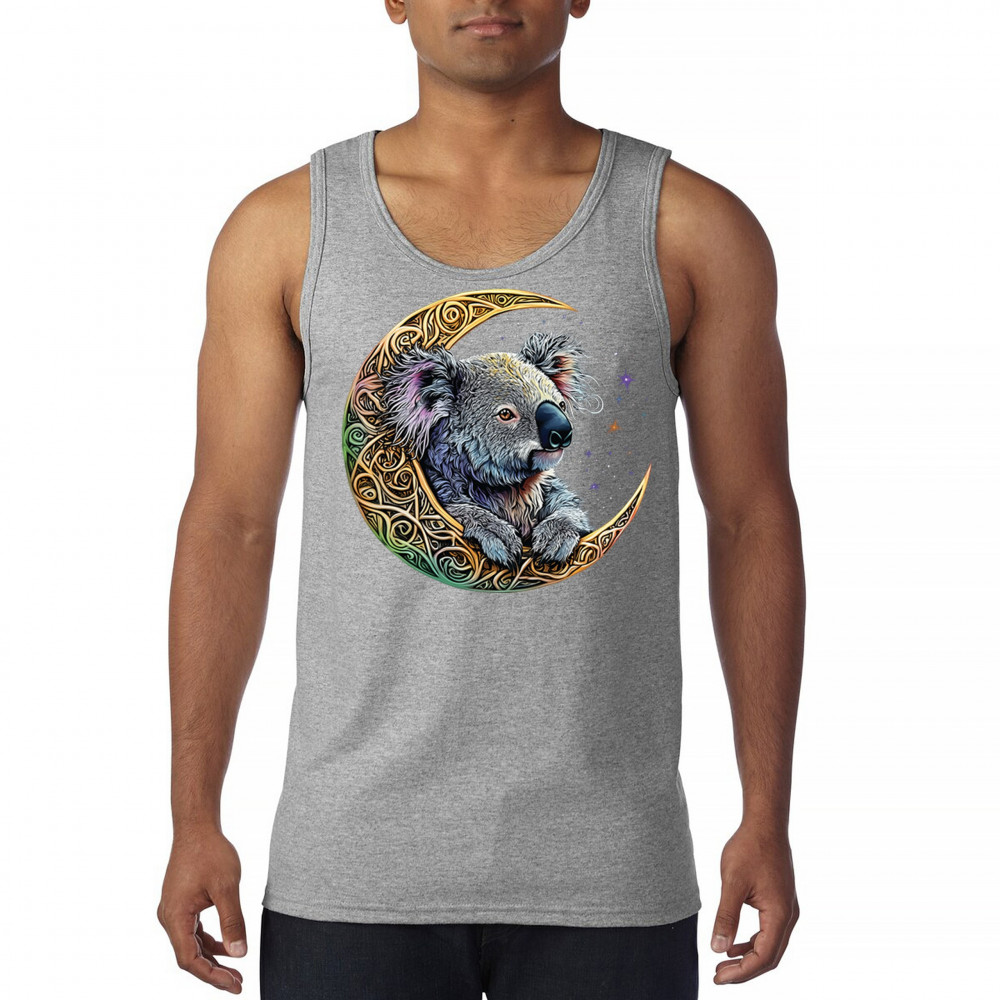 Koala resting in Celtic crescent moon with cosmic sky. A peaceful design for nature lovers, spiritual thinkers, and fantasy art fans.