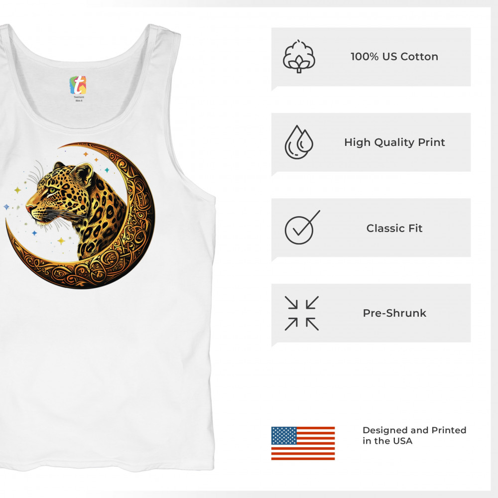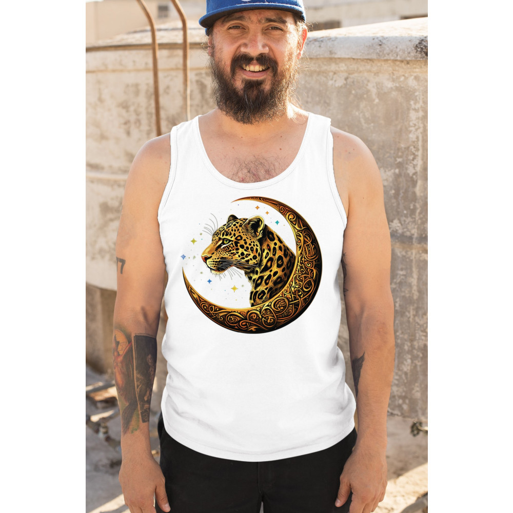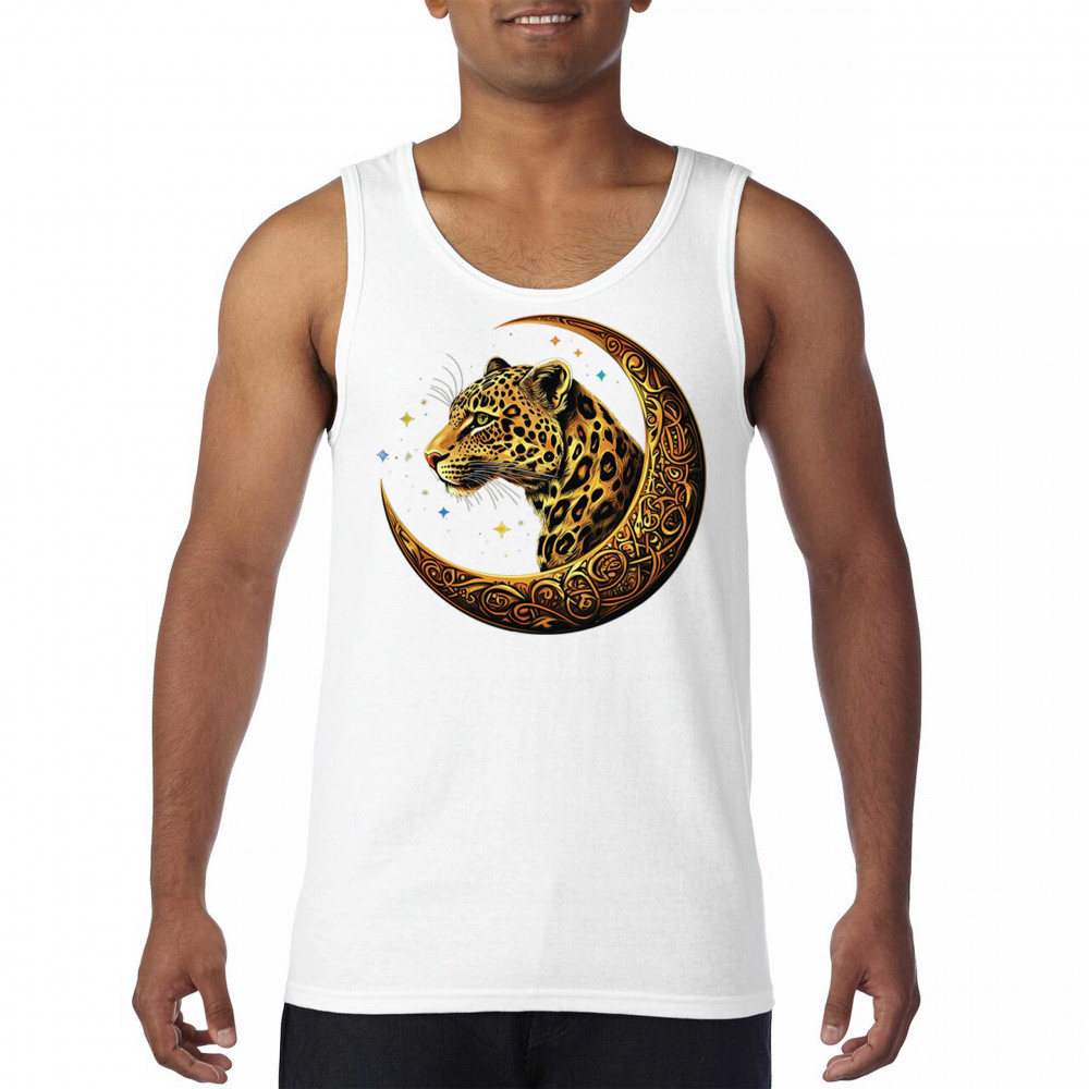 Unleash wild energy and spiritual symbolism with this bold leopard design set inside a golden Celtic crescent moon. A cosmic starry background amplifies its mystical vibe, symbolizing agility, independence, and awareness. Perfect for big cat lovers, jungle animal fans, and seekers of fantasy or tribal-inspired art.