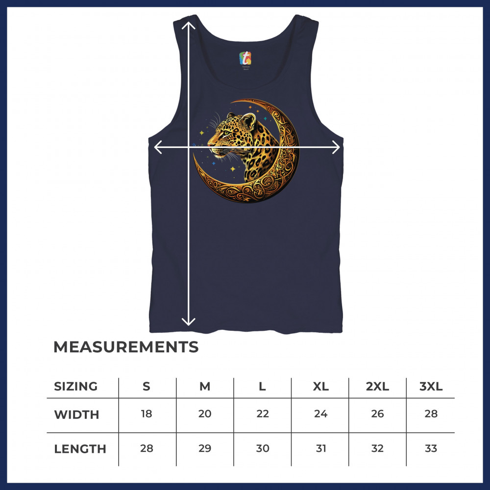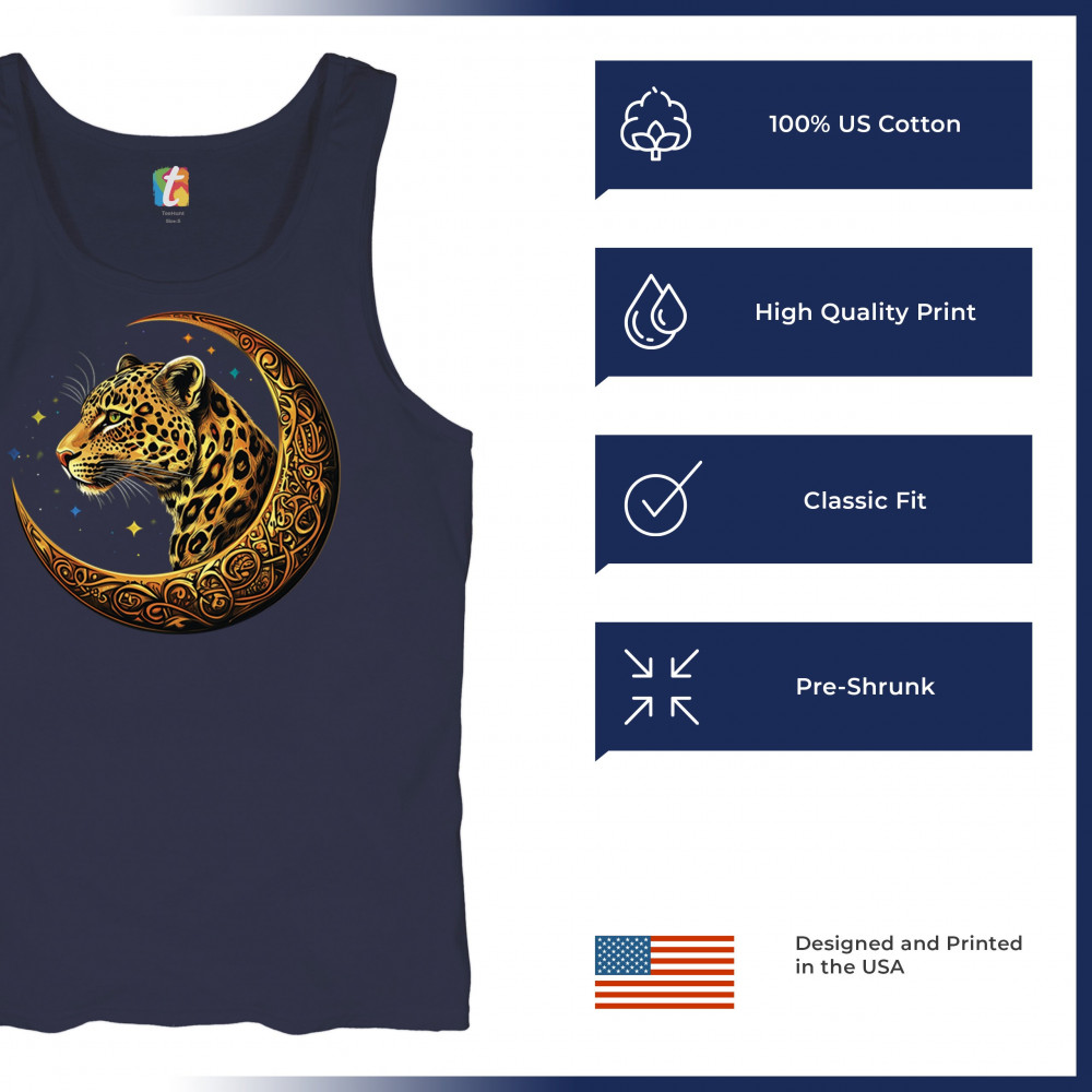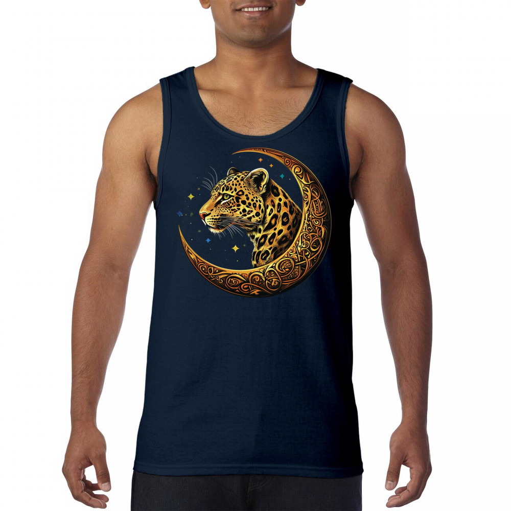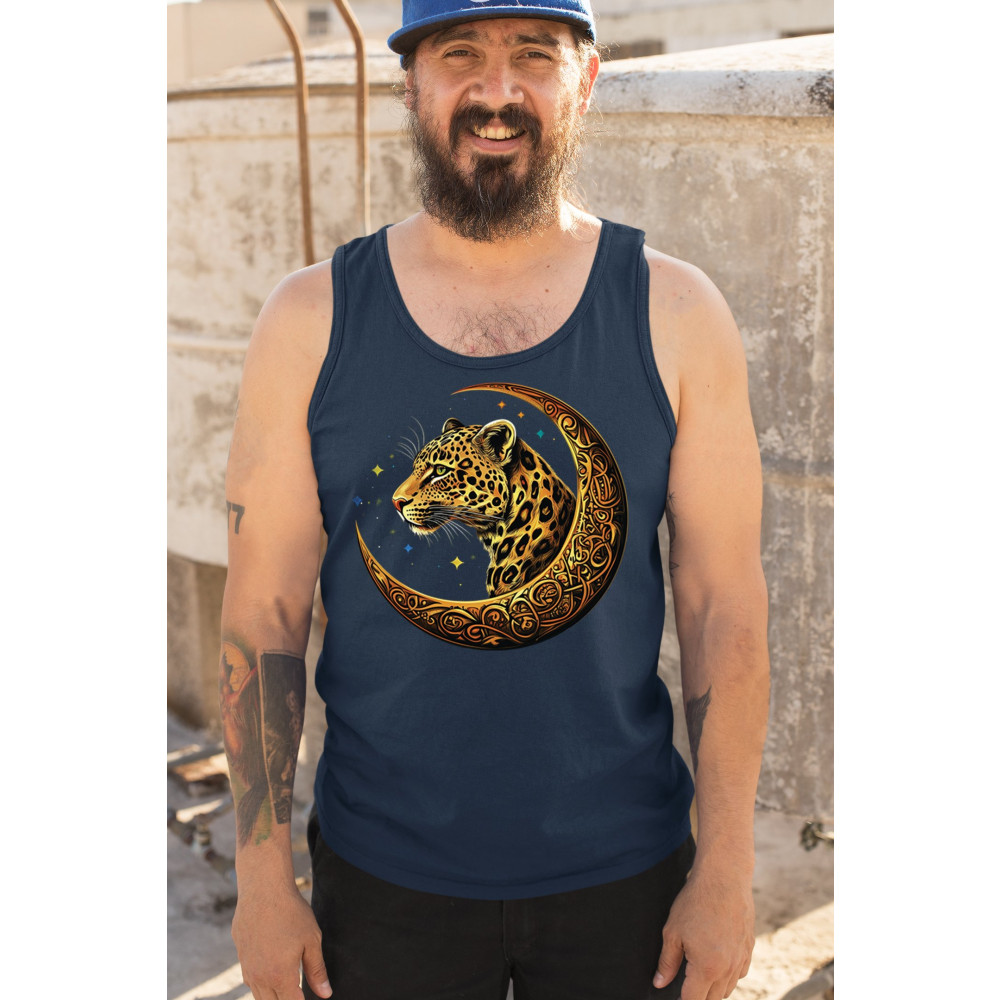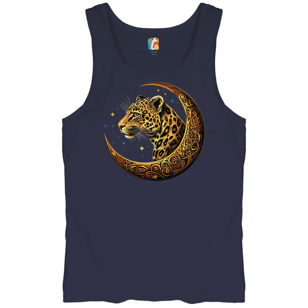 Unleash wild energy and spiritual symbolism with this bold leopard design set inside a golden Celtic crescent moon. A cosmic starry background amplifies its mystical vibe, symbolizing agility, independence, and awareness. Perfect for big cat lovers, jungle animal fans, and seekers of fantasy or tribal-inspired art.