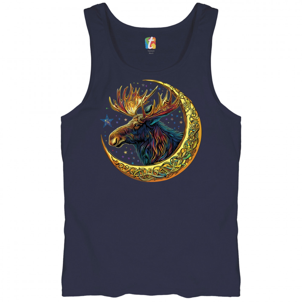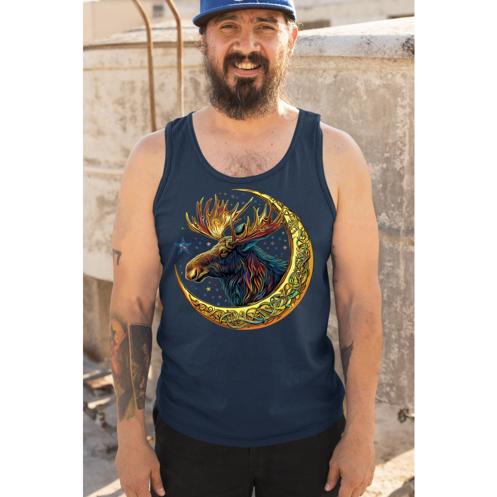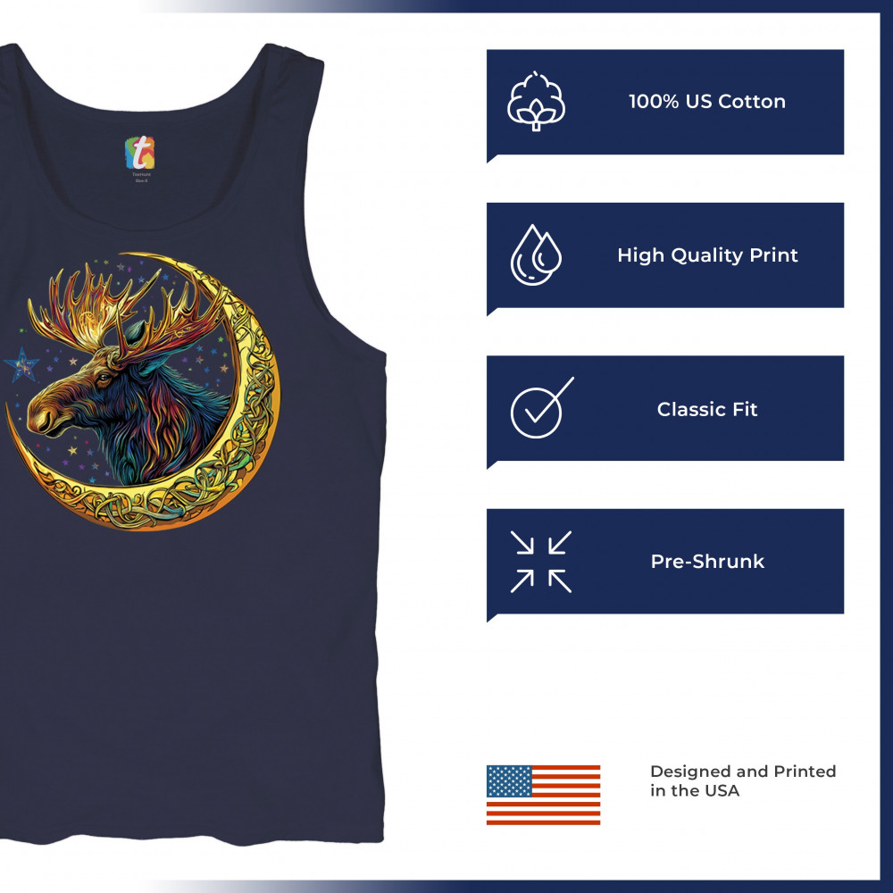 Mystical moose in gold Celtic crescent moon design—symbolizes strength, nature wisdom, and cosmic spirit for fantasy lovers and woodland fans.