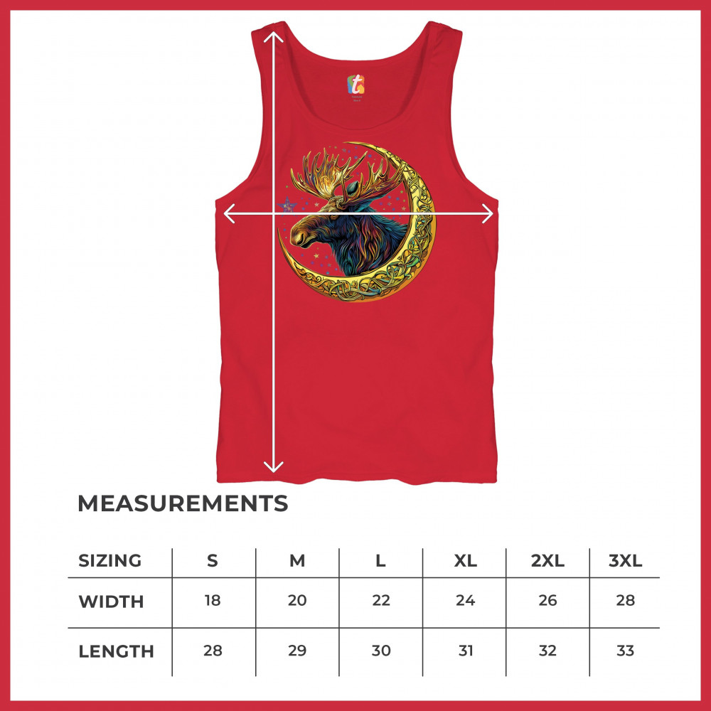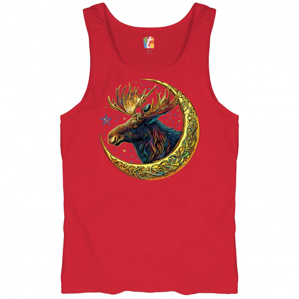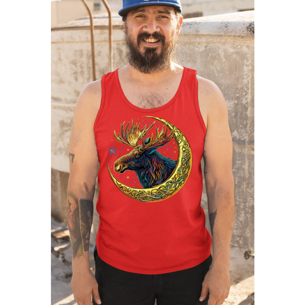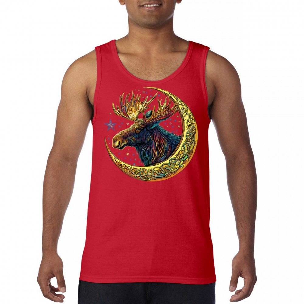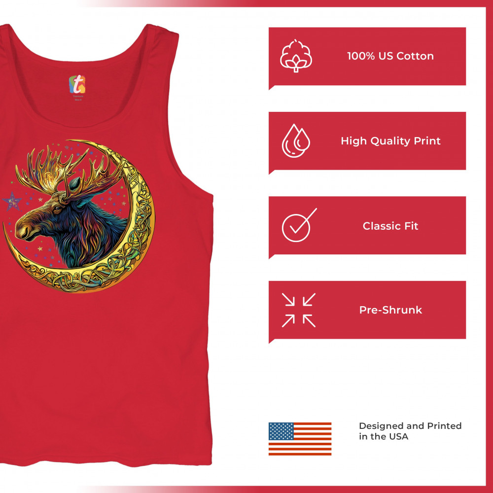 Mystical moose in gold Celtic crescent moon design—symbolizes strength, nature wisdom, and cosmic spirit for fantasy lovers and woodland fans.