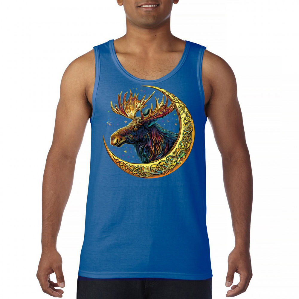 Mystical moose in gold Celtic crescent moon design—symbolizes strength, nature wisdom, and cosmic spirit for fantasy lovers and woodland fans.