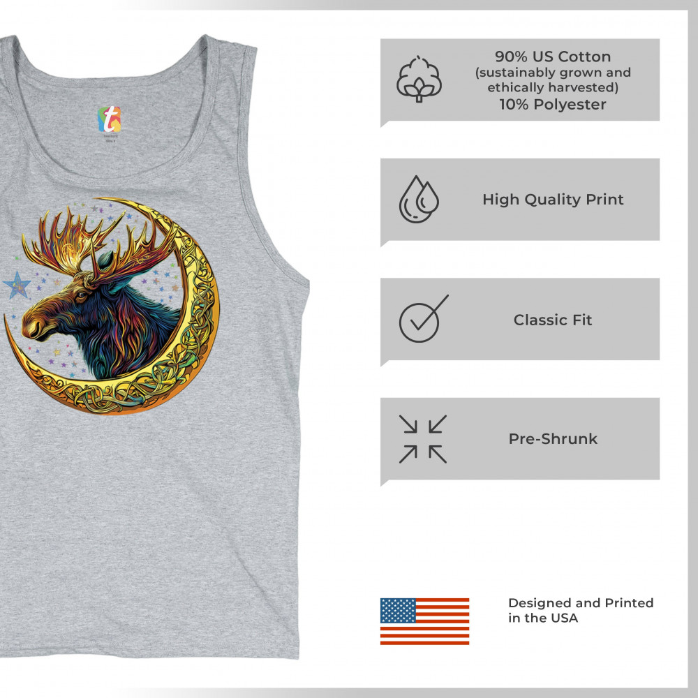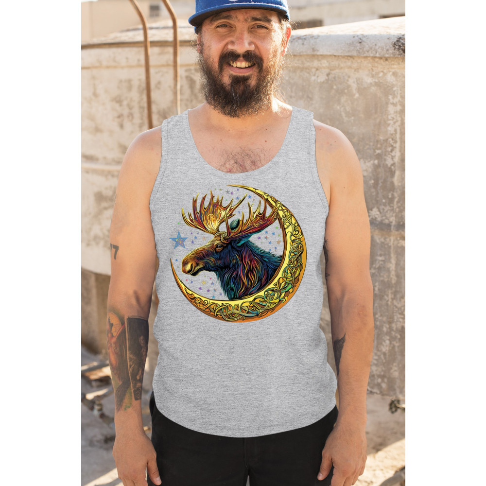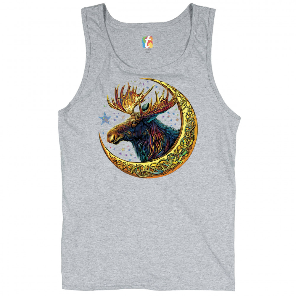 Mystical moose in gold Celtic crescent moon design—symbolizes strength, nature wisdom, and cosmic spirit for fantasy lovers and woodland fans.